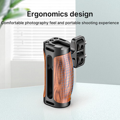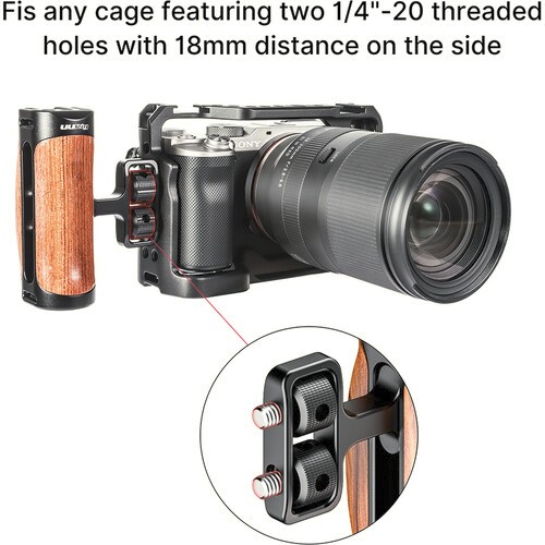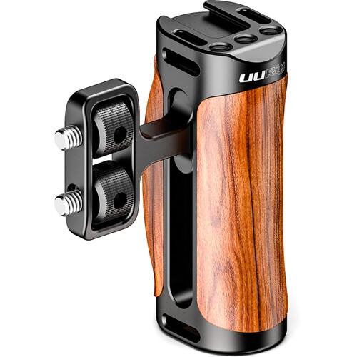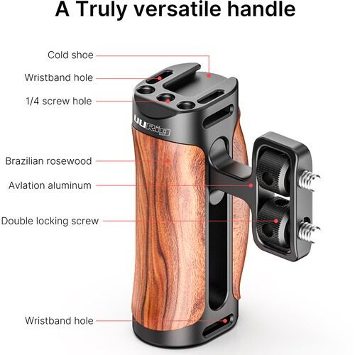 Univerzální dřevěná rukojeť Ulanzi R075 Left/Right kombinuje prvotřídní brazilské palisandrové dřevo s leteckým hliníkem a poskytuje pohodlné a bezpečné uchopení s univerzálními možnostmi upevnění pro kamerové klece.