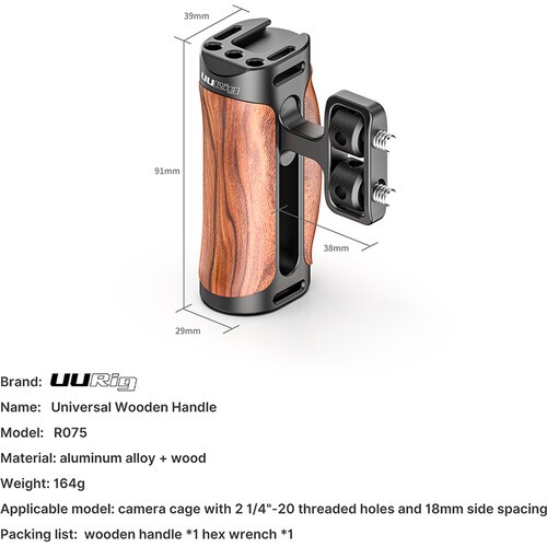 Univerzální dřevěná rukojeť Ulanzi R075 Left/Right je navržena tak, aby zlepšila manipulaci s kamerou, stabilitu a estetiku pro filmaře a tvůrce obsahu. Rukojeť je vyrobena z brazilského palisandru a hliníkové slitiny a nabízí přirozeně teplý, ergonomický úchop při zachování odolnosti pro profesionální použití.