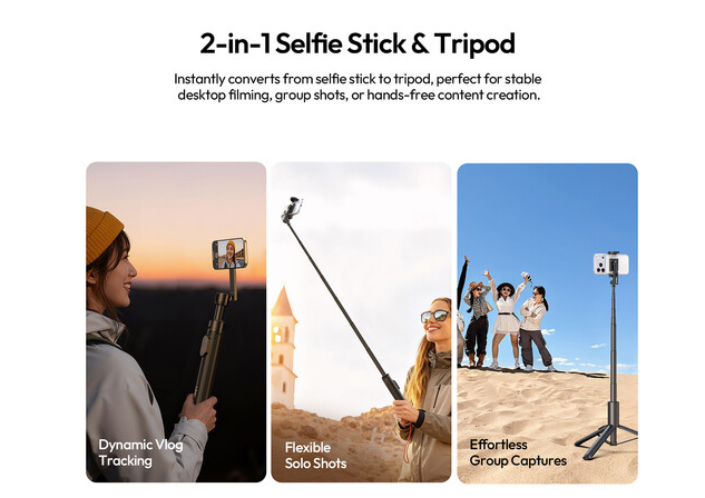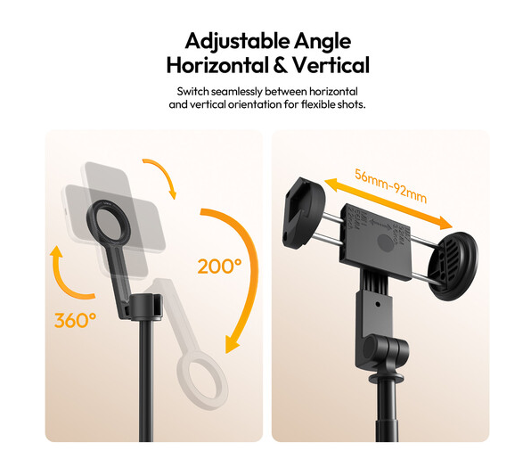 Díky maximální délce vysunutí až 154 cm poskytuje tato selfie tyč vynikající dosah pro široké skupinové snímky a záběry z výšky. Nastavitelná hlava podporuje otáčení o 360° a naklonění o 200°, což umožňuje plynulé přepínání mezi horizontálním a vertikálním režimem snímání pro maximální kreativní kontrolu.