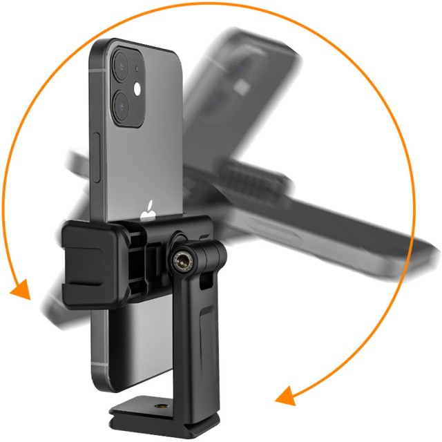 Držák také podporuje naklonění o 180° dopředu a dozadu, což vám umožňuje jemně doladit úhly natáčení bez nutnosti použití gimbalu. Standardní otvor se závitem 1/4"-20 na základně umožňuje snadné připevnění ke stativům, selfie tyčím nebo jiným podpěrám.