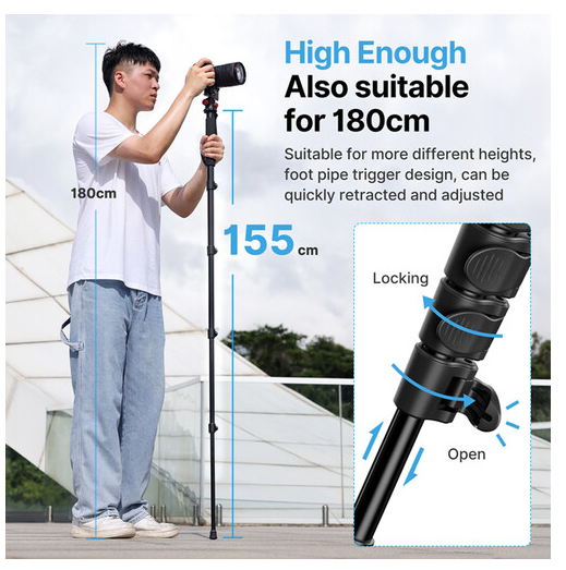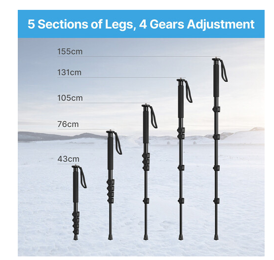 Hliníkový monopod Ulanzi (61") je lehká a univerzální podpora pro fotoaparáty a zařízení do hmotnosti 11 liber. S maximální výškou 61" a délkou ve složeném stavu 17" je tento monopod vybaven 5sekčním systémem aretace nohou, dvojitými šroubovými úchyty 1/4"-20 a 3/8"-16 a pohodlnou pěnovou rukojetí. Je ideální pro použití jako selfie tyč i monopod a je navržen tak, aby byl stabilní, přenosný a snadno použitelný v různých situacích při fotografování.