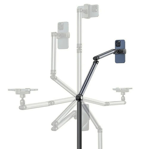 Dvojité otočné ramena o délce 11,8 palce umožňují univerzální polohování: jedno rameno se otáčí o 270°, druhé o 360° a lze je snadno nastavit a zajistit pomocí přiložených imbusových klíčů. Váš smartphone je bezpečně uchycen v silikonové svorkě, která se hodí pro zařízení o šířce 2,36" až 3,62" a otáčí se o 360°, takže můžete snadno přepínat mezi orientací na výšku a na šířku.