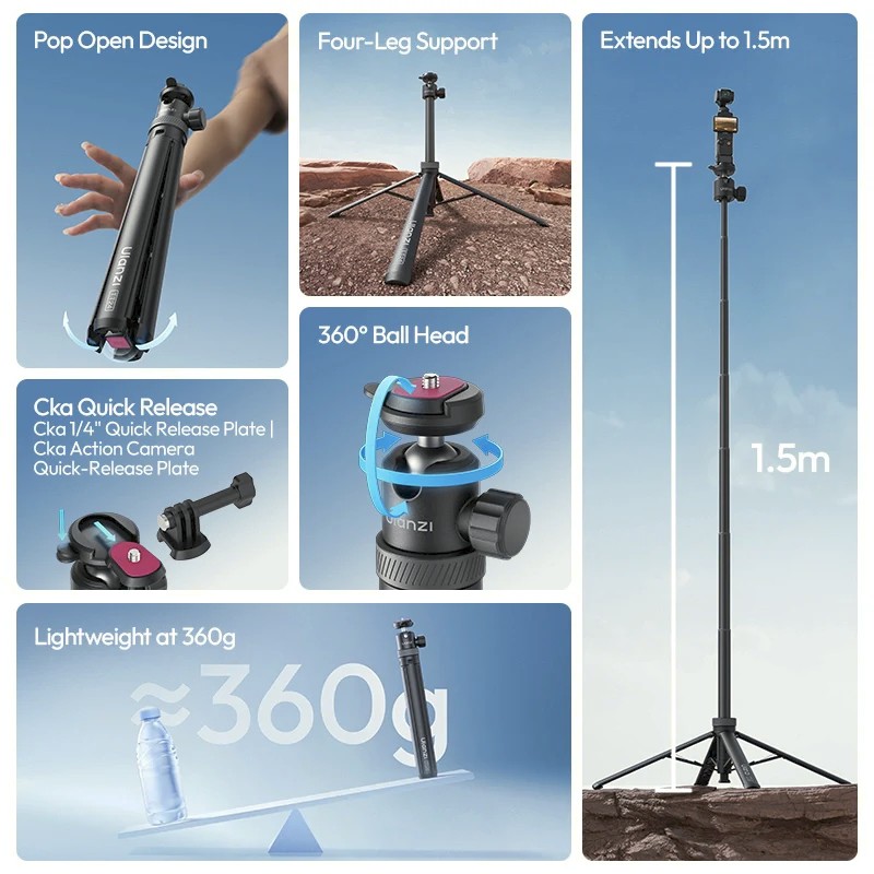Selfie tyč Ulanzi TT24 Cka Quick-Release je určena pro tvůrce, kteří vyžadují rychlost, stabilitu a flexibilitu. Její design typu „drop-to-ready“ se okamžitě otevírá pomocí čtyř protiskluzových nohou a poskytuje stabilní nastavení stativu na podlaze. Univerzální kulová hlava umožňuje plynulou rotaci o 360° a rychlé přepínání mezi režimy na výšku a na šířku.