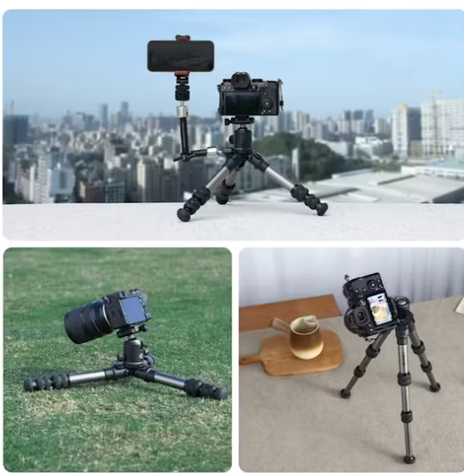 Nohy s otočným zámkem nabízejí plynule nastavitelnou výšku od 140 mm do 440 mm a mechanismus rychlého nastavení úhlu umožňuje snadné nastavení nízkého úhlu. Je vyroben z tlustého hliníku, unese až 20 kg a odnímatelné protiskluzové gumové nožičky zajišťují stabilitu na jakémkoli povrchu. Vestavěný 1/4palcový boční držák umožňuje připevnění příslušenství, jako je držák na smartphone, LED světlo nebo magické rameno, což zvyšuje univerzálnost pro různé scénáře fotografování.