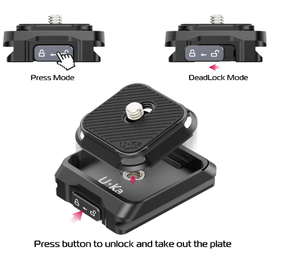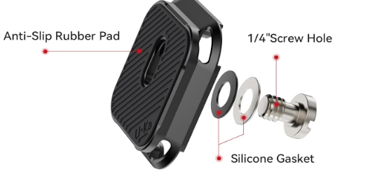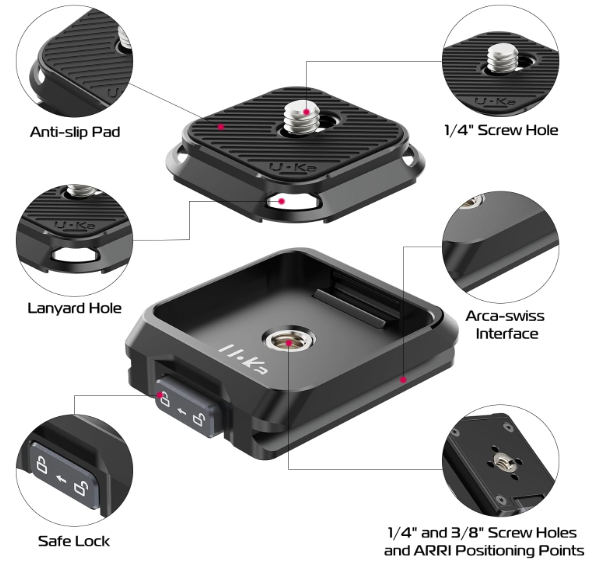 Rychloupínací deska Ulanzi UKA02 je ultralehký hliníkový adaptér o hmotnosti 16 g, který umožňuje okamžitý přechod mezi stativy, stabilizátory, gimbaly a klecemi pomocí standardního šroubu 1/4"-20, který je kompatibilní s většinou fotoaparátů a videokamer. Jeho kompaktní design o rozměrech 8,3 × 2,8 × 8,1 cm zahrnuje čtyři otvory pro poutko v rozích pro snadné přenášení, což z něj činí ideální řešení pro tvůrce, kteří mění nastavení za běhu.