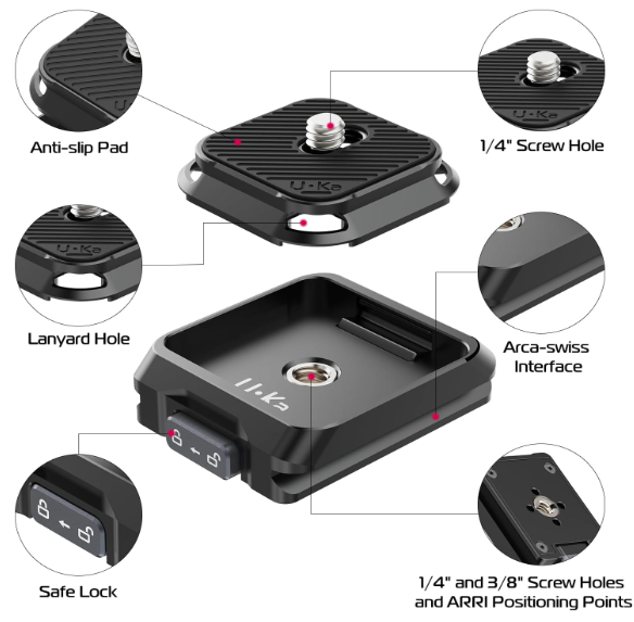 Rychloupínací základna Ulanzi UKA03 je kompaktní, letecký hliníkový výkonný nástroj pro plynulou výměnu vybavení, který váží pouhých 52 g, ale unese až 20 kg zátěž pro digitální zrcadlovky, bezzrcadlovky jako Sony A1 nebo Canon 1D X, Osmo Pocket 3, držáky telefonů a zařízení standardu Arca díky svým univerzálním šroubům 1/4"-3/8" a polohovacím otvorům Arri. Je vybavena plně uzavřeným protiskluzovým zámkem s bezpečnostním mechanismem typu „slide-to-secure“ a dvojitým vylepšením proti uvolnění – texturovanou gumovou podložkou pro vynikající přilnavost a šrouby s dvojitým těsněním – a zajišťuje tak pevnou stabilitu bez náhodných pádů, to vše ve složeném rozměru 3,8 x 1,5 x 0,4 palce, který umožňuje 4směrné čtvercové upevnění na stativy, klece nebo rigy, což z něj činí nepostradatelný lehký doplněk pro cestovní fotografy a kameramany.