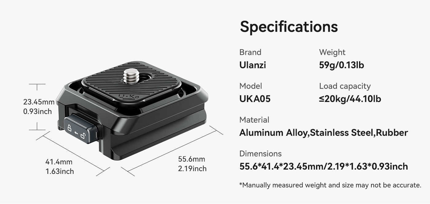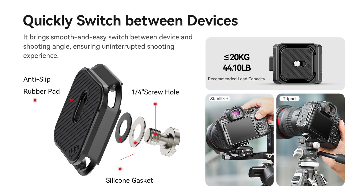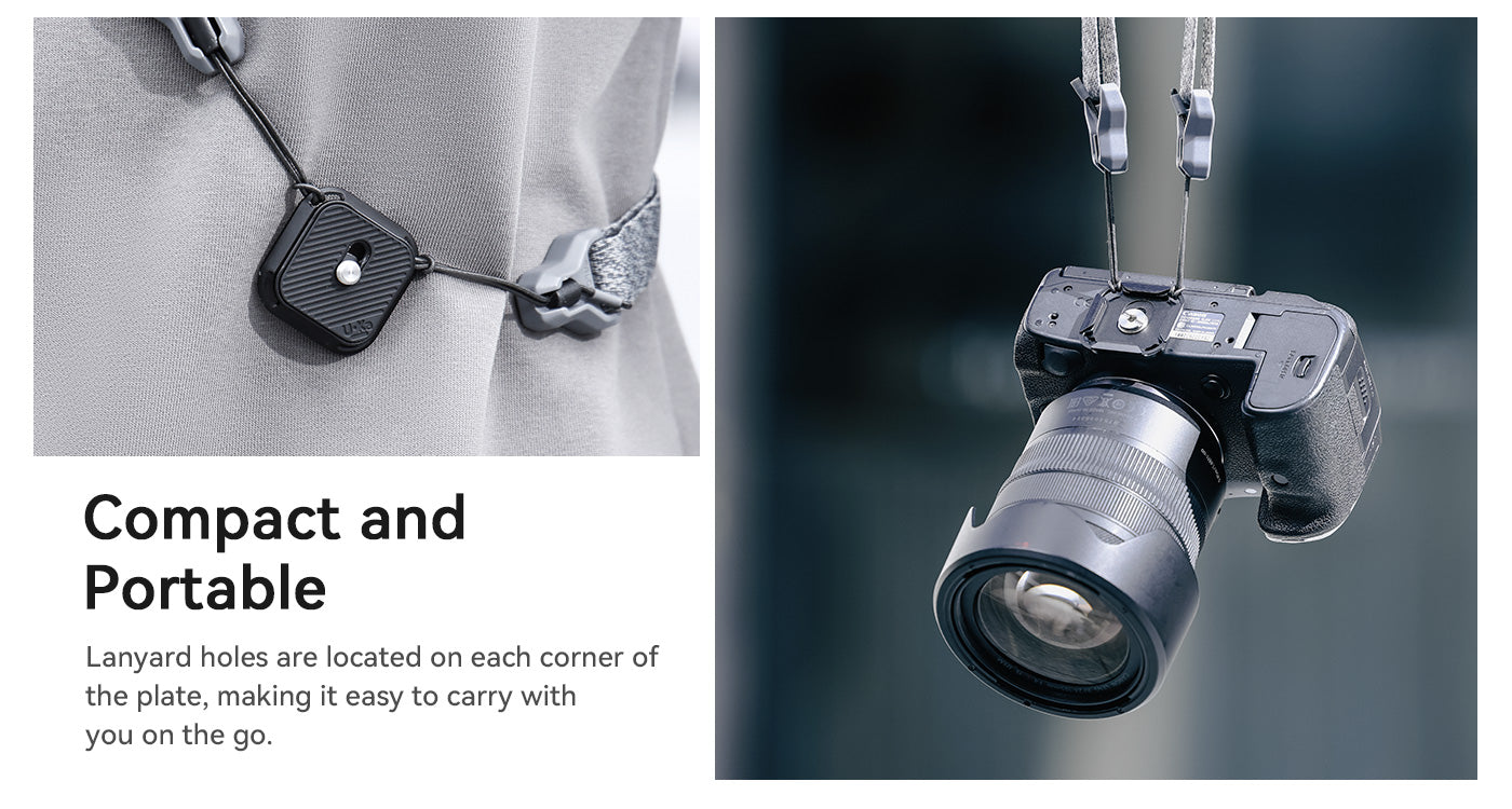 Sada Ulanzi UKA05 Uka Quick Release Kit pro DJI RS2/3/4 je dokonalým vylepšením pro rychlé a bezpečné upevnění kamery. Je kompatibilní s Arca-Swiss, Uka a F38, nabízí instalaci v jednom kroku, protiskluzové gumové podložky a bezpečnostní zámek, který zabraňuje náhodnému uvolnění. Díky kompaktní konstrukci a designu připravenému pro připevnění šňůrky je ideální pro tvůrce na cestách a je nepostradatelným doplňkem pro uživatele stabilizátorů DJI RS.