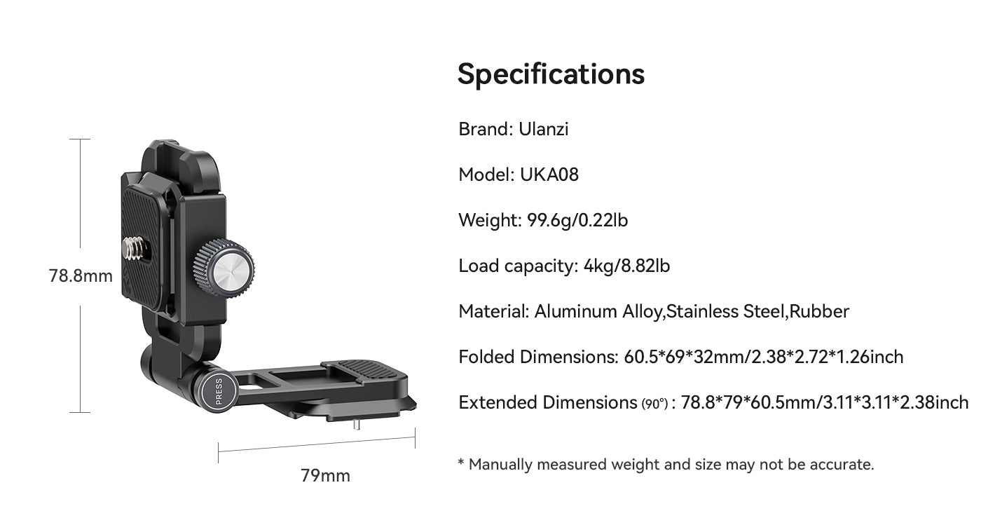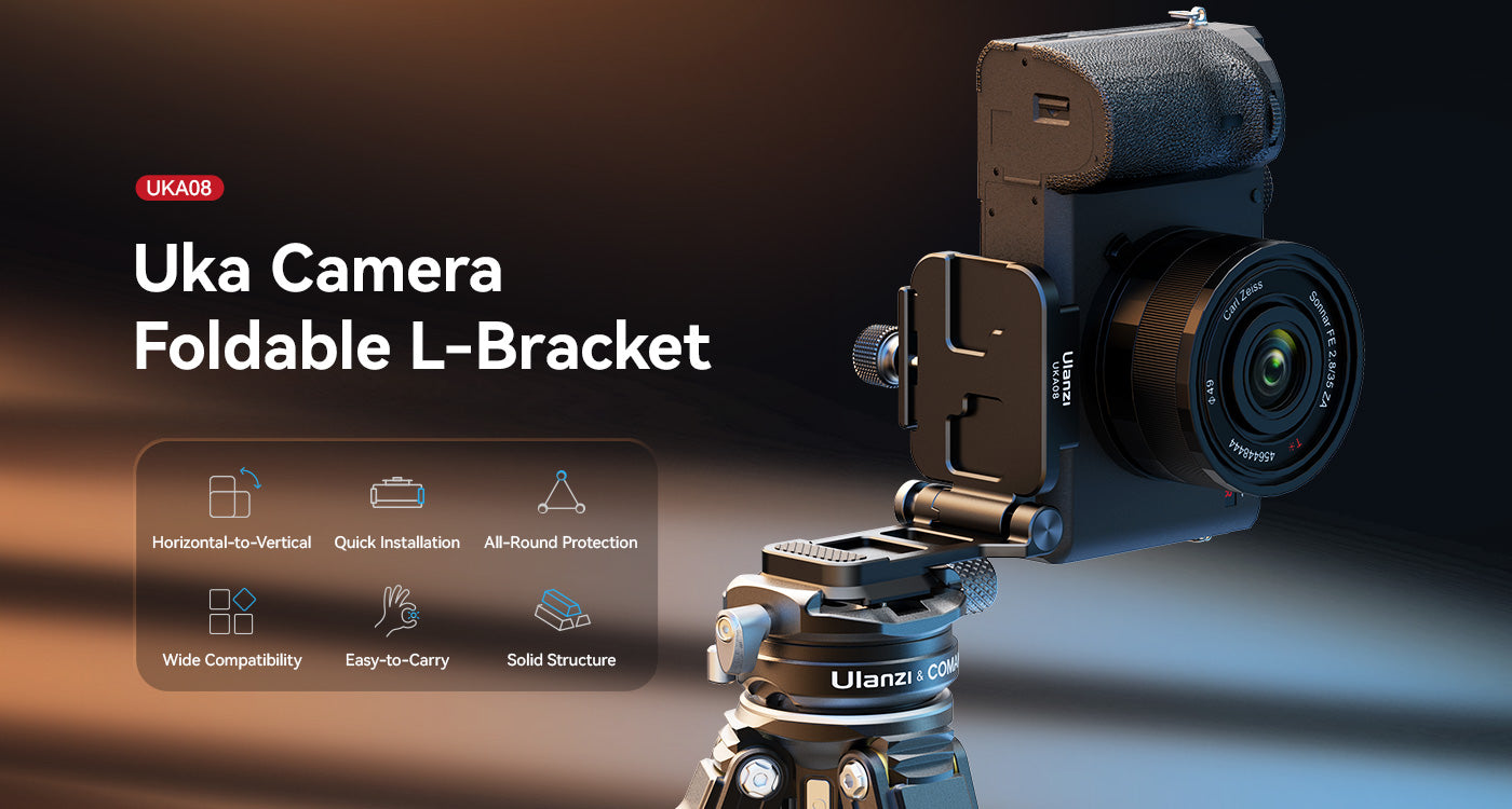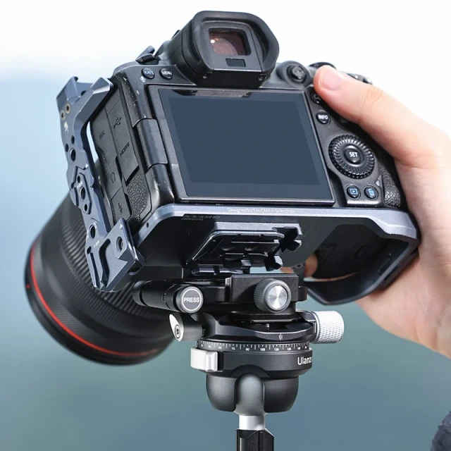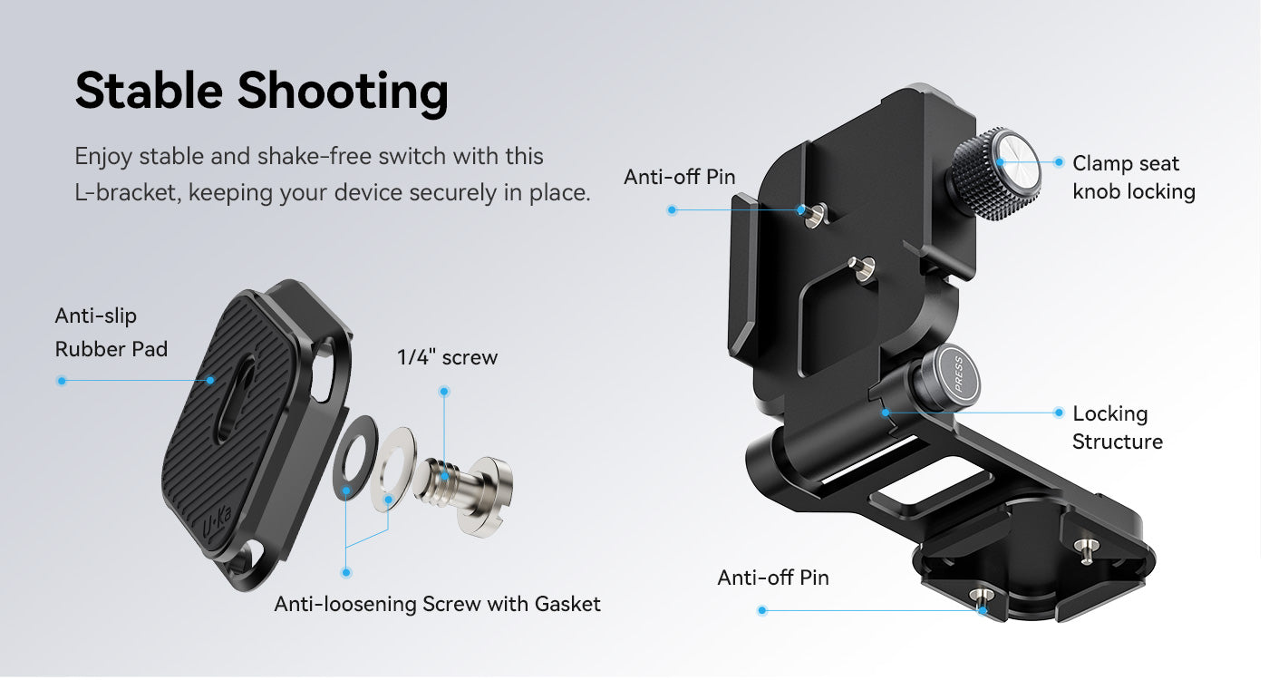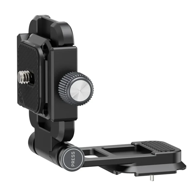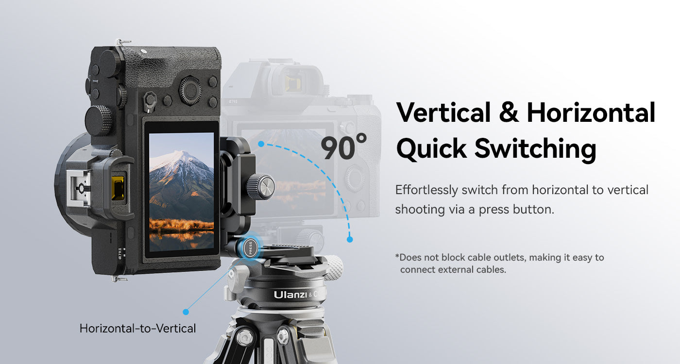 Sklopný L-držák. Rychlé přepínání mezi vertikální a horizontální polohou Jediným stisknutím tlačítka můžete snadno přepínat mezi horizontálním a vertikálním fotografováním. Kompatibilní s většinou rychloupínacích desek. Snadné zamykání a odemykání pomocí otočného knoflíku.