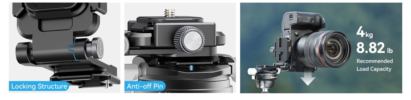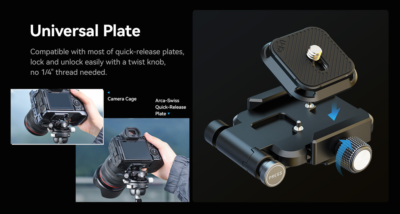 Univerzální deska Kompatibilní s většinou rychloupínacích desek. Snadné zamykání a odemykání pomocí otočného knoflíku. Není potřeba 1/4" závit.