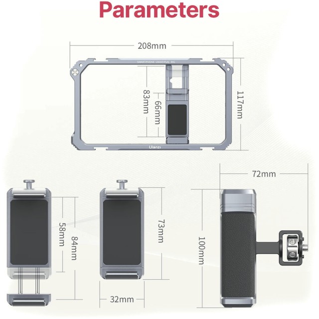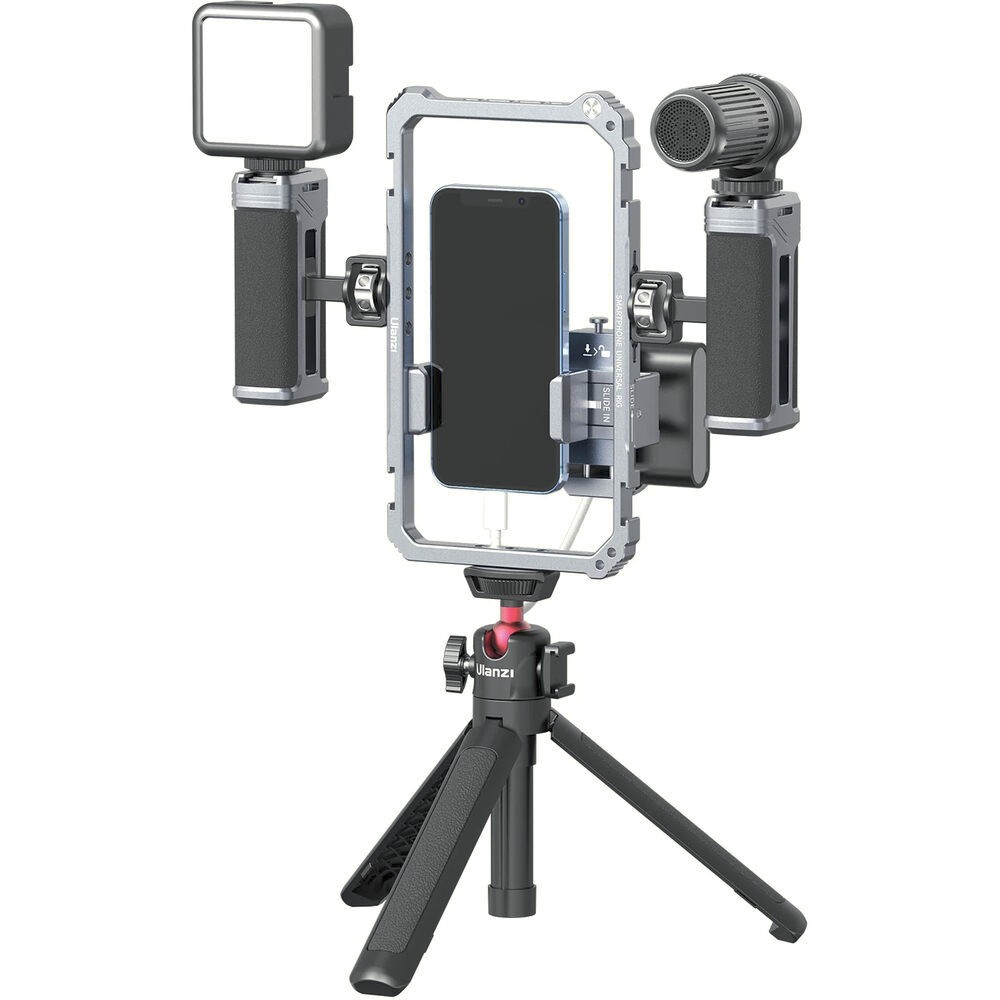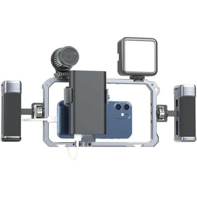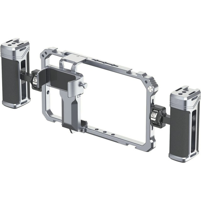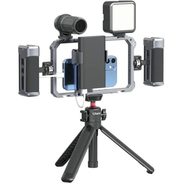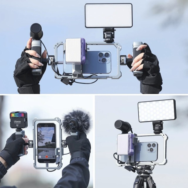 Ulanzi Universal Phone Vlogging Video Rig je univerzální profesionální držák pro smartphony, který nabízí dvě nastavitelné rukojeti, několik upevňovacích bodů a protiskluzové polstrování pro stabilizaci záběrů při natáčení vlogů, streamování nebo mobilním filmování.
