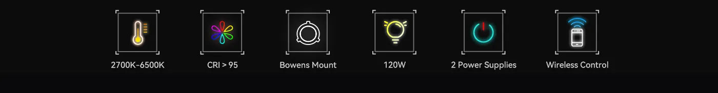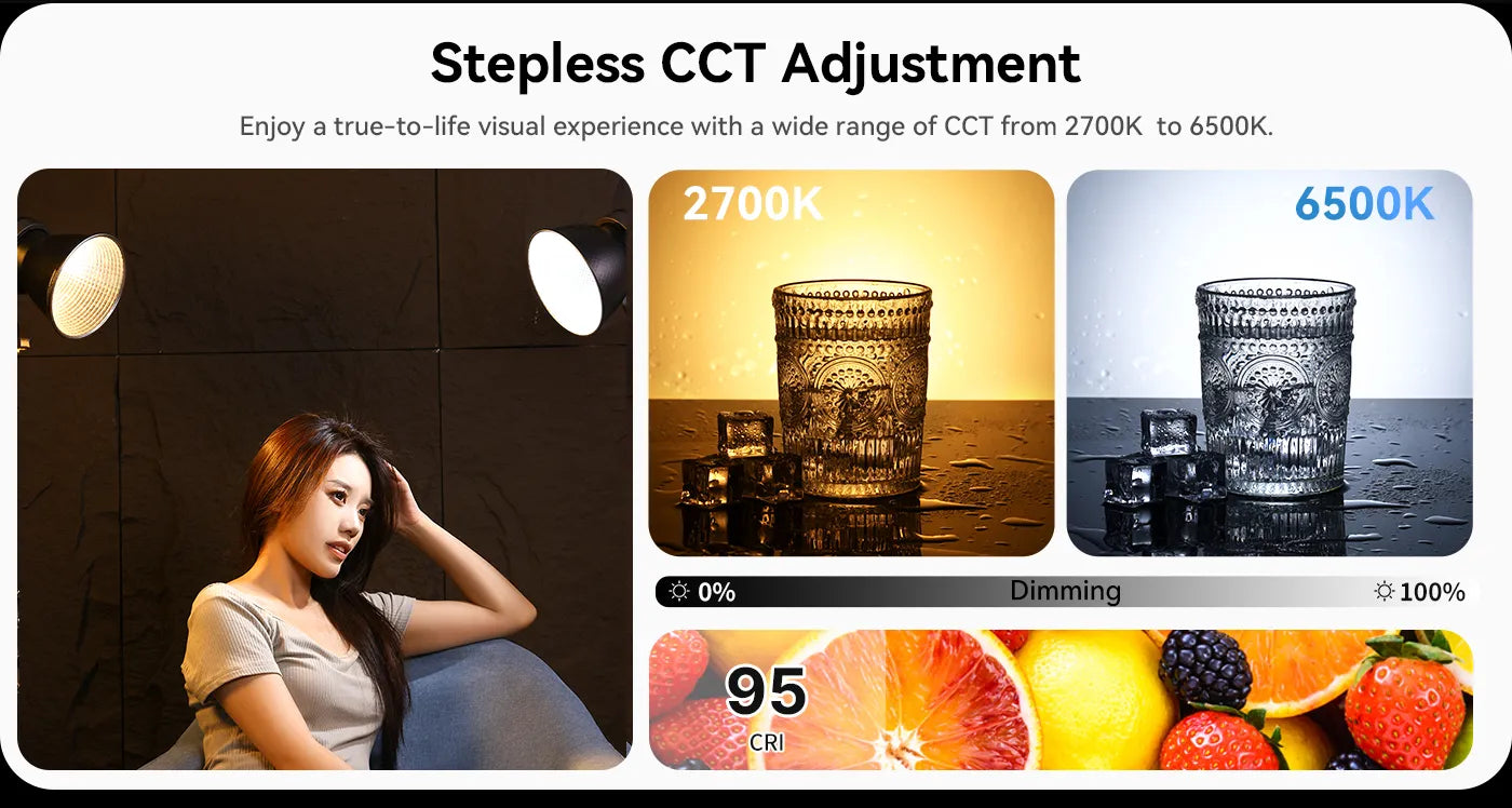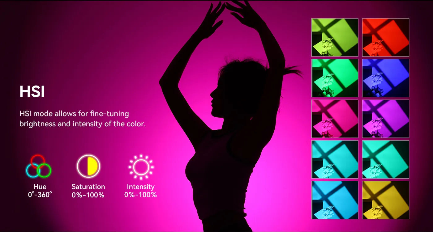 Díky dvojímu napájení můžete venku použít baterii V-mount pro mobilitu nebo uvnitř DC napájecí adaptér pro stabilní napájení. Nastavte barevnou teplotu plynule od 2700 K do 6500 K (CRI > 95) a ztlumte od 0 % do 100 %. V režimu HSI můžete jemně doladit odstín, sytost a intenzitu v celém 360° barevném spektru.