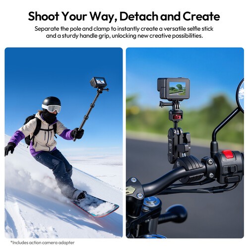 Selfie tyč s rychloupínáním umožňuje rychlé nastavení a úpravu, což usnadňuje přepínání mezi různými úhly záběru nebo sejmutí kamery v případě potřeby. Přiložený adaptér pro akční kamery zajišťuje širokou kompatibilitu s oblíbenými akčními kamerami, díky čemuž je vhodný pro motocyklismus, lyžování, cyklistiku a další extrémní sporty.