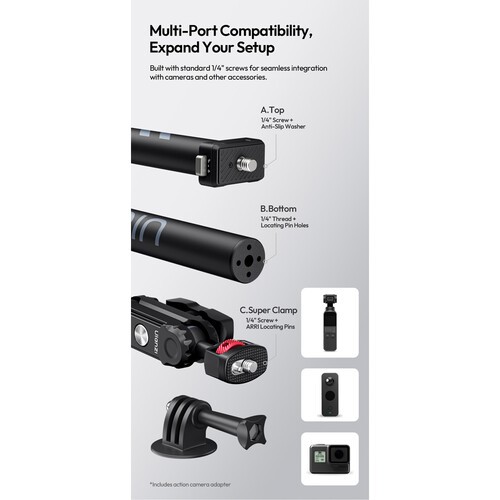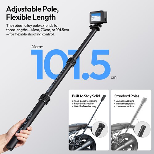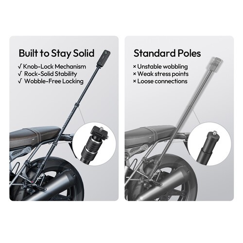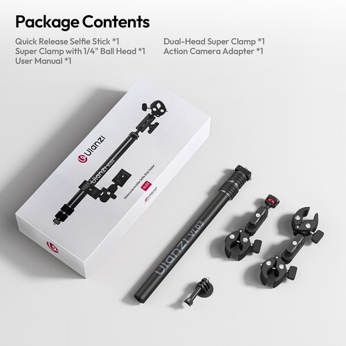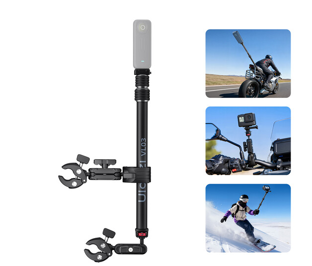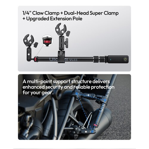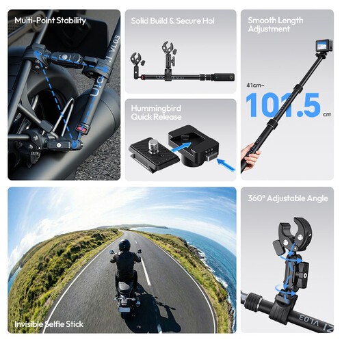 Držák na motorku Ulanzi VL03 Invisible Selfie Stick Holder je odolný a stabilní upevňovací systém určený k pořizování plynulých, filmových záběrů při jízdě vysokou rychlostí. Díky vylepšené konfiguraci se dvěma svorkami – 1/4" svorkou s drápem a super svorkou s kulovou hlavou – zajišťuje naprostou stabilitu při jízdě na motorce, při akčních sportech i při outdoorových dobrodružstvích. Je kompatibilní s akčními kamerami a selfie tyčemi a nabízí odolnost proti vibracím pro záběry z vlastního pohledu v profesionální kvalitě.