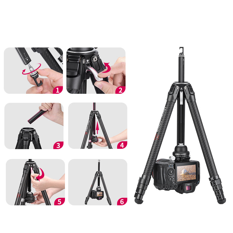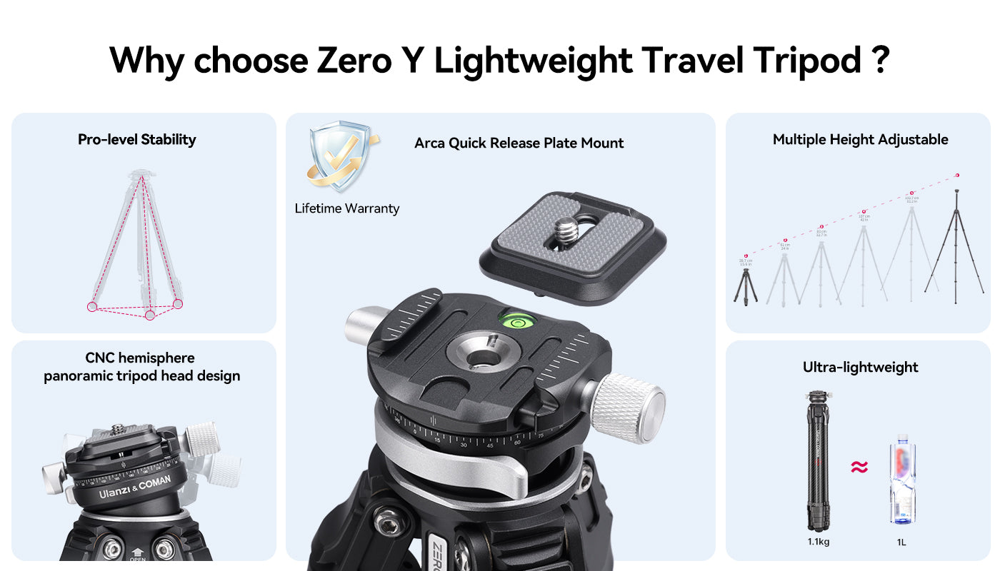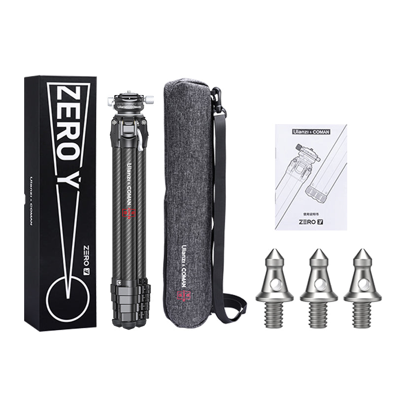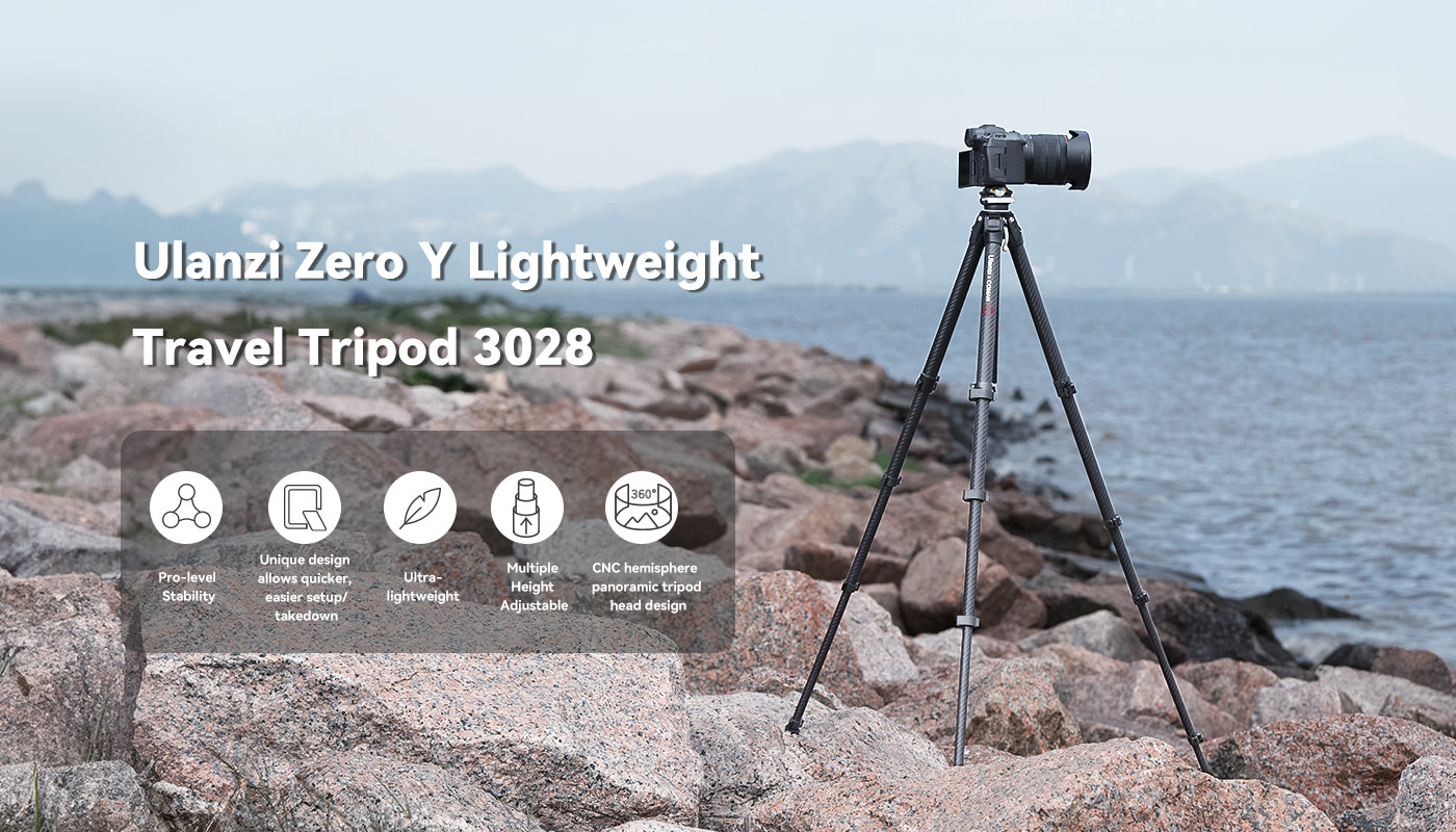 Lehký cestovní stativ Ulanzi Zero-Y z uhlíkových vláken 3028. Stabilita na profesionální úrovni. Unikátní design umožňuje rychlejší a snadnější sestavení/rozložení. Ultra lehký. Nastavitelná výška. CNC polokulovitá panoramatická hlava stativu.
