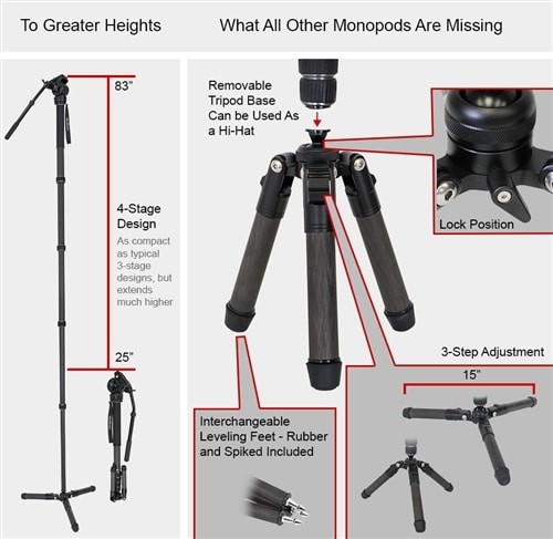 Konstrukce z uhlíkových vláken se skládá do kompaktní velikosti pro přepravu a lze ji vysunout na délku přes 2 metry, přičemž si zachovává vynikající tuhost. Vysoce kvalitní otočné zámky zajišťují rychlé a bezpečné nastavení výšky během fotografování v pohybu. Sklopná základna stativu se zamyká do tří poloh pro flexibilní ovládání a lze ji zcela odstranit, aby bylo možné systém používat jako standardní monopod. Nastavitelné gumové nožičky umožňují přesné vyrovnání, zatímco přiložené hrotové nožičky poskytují extra přilnavost na nerovných nebo venkovních površích.