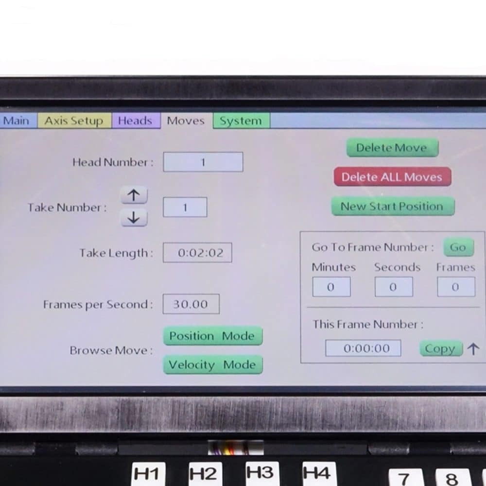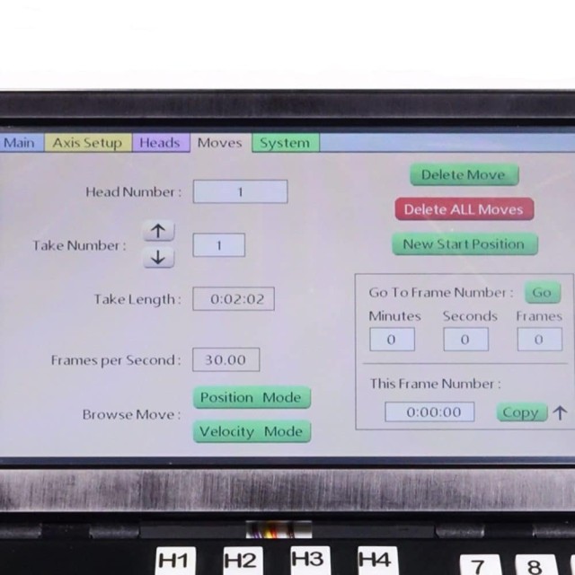 Ovládací osy: otáčení, naklánění, zoom, zaostření, clona, kolejnice/dolly, rameno