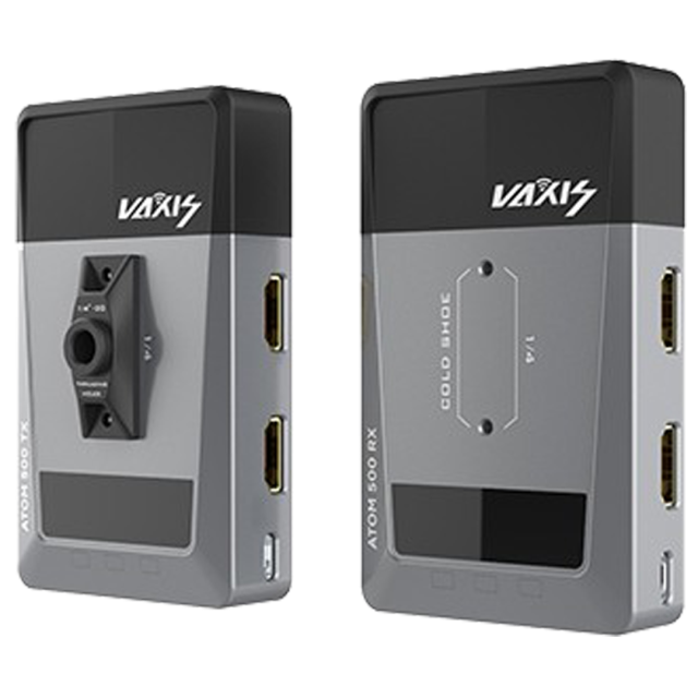 Bezdrátová sada Atom 500 HDMI TX/RX od společnosti Vaxis je vybavena připojením HDMI a umožňuje přenášet vizuálně bezeztrátové videosignály 1080p H.265 v pásmu 5 GHz s latencí menší než 80 ms a s dosahem až 150 m přímé viditelnosti. Dále umožňuje multicasting přes Wi-Fi až na tři zařízení se systémem iOS pro monitorování a nabízí jasný stavový displej OLED, konektor USB-C pro napájení (kabel typu C je součástí dodávky) a upgrade, slot pro baterii řady L (baterie není součástí dodávky) a možnost vypnout chladicí ventilátor během natáčení.