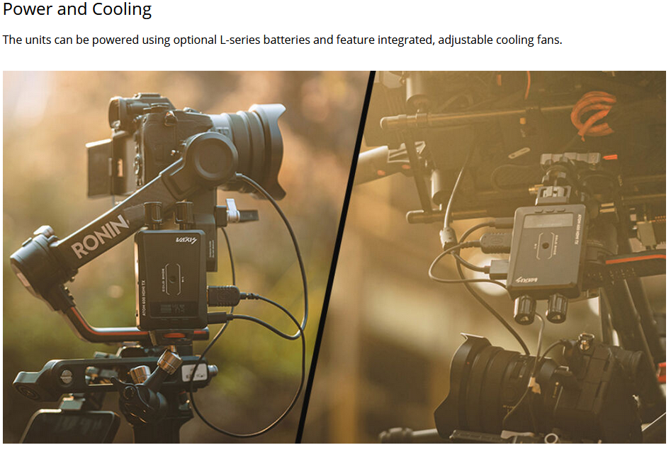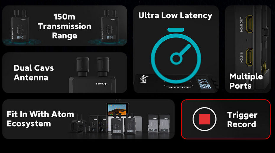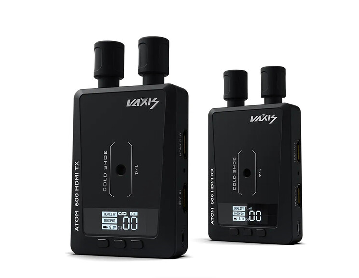 Sada bezdrátového video vysílače/přijímače Vaxis Atom 600 HDMI poskytuje vizuálně bezztrátové video v rozlišení 1080p60 s latencí méně než 80 ms v dosahu 600 stop, podporuje simultánní přenos až na pět zařízení (dva přijímače a tři mobilní aplikace), je vybavena duálními anténami 2,4/5,8 GHz, nastavitelnými chladicími ventilátory, OLED displeji, kompatibilitou s bateriemi řady L a portem USB-C pro aktualizace firmwaru a výstup 5 V/2 A.