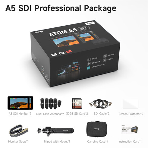 Profesionální balíček Vaxis Atom A5 SDI Monitor nabízí kompletní bezdrátové video řešení se dvěma 5,5" dotykovými monitory TX/RX s rozlišením 1920 x 1080, každý s jasem 2000 cd/m², vstupy/výstupy SDI/HDMI se smyčkovými výstupy, dosahem přenosu 1000', nahráváním MP4 na microSD, dvěma bateriovými deskami L500 a nástroji CINE OS včetně 3D LUT a osciloskopů, v balení s devíti anténami, dvěma 32GB SD kartami, dvěma SDI kabely, ochrannými fóliemi na displej, popruhem na monitor, výsuvným stativem s držákem a ochranným přenosným pouzdrem.