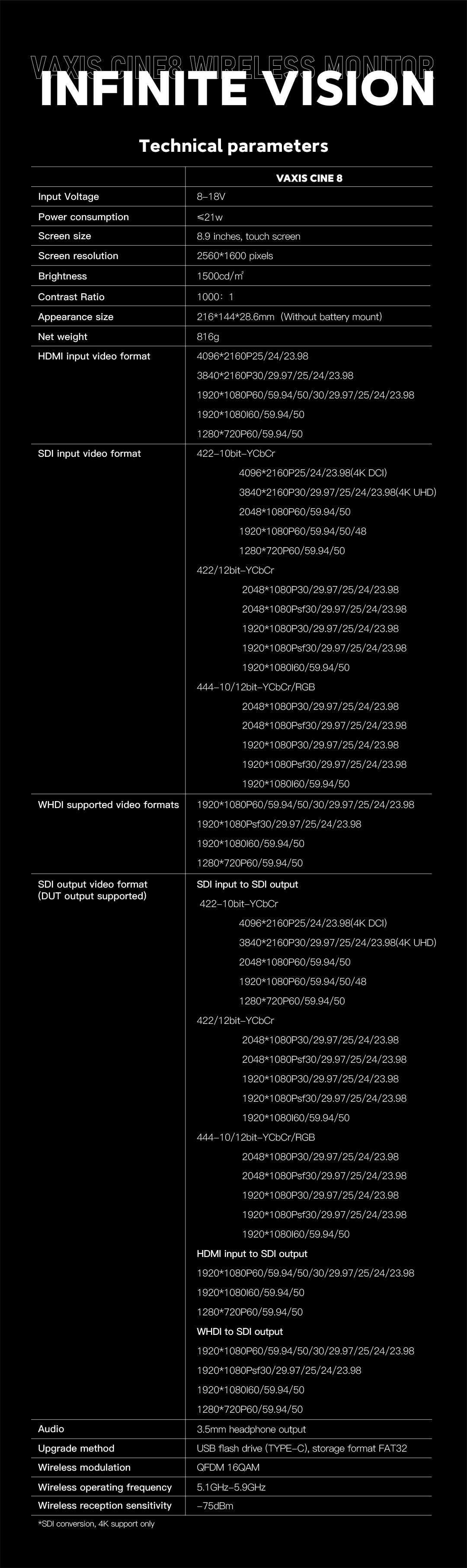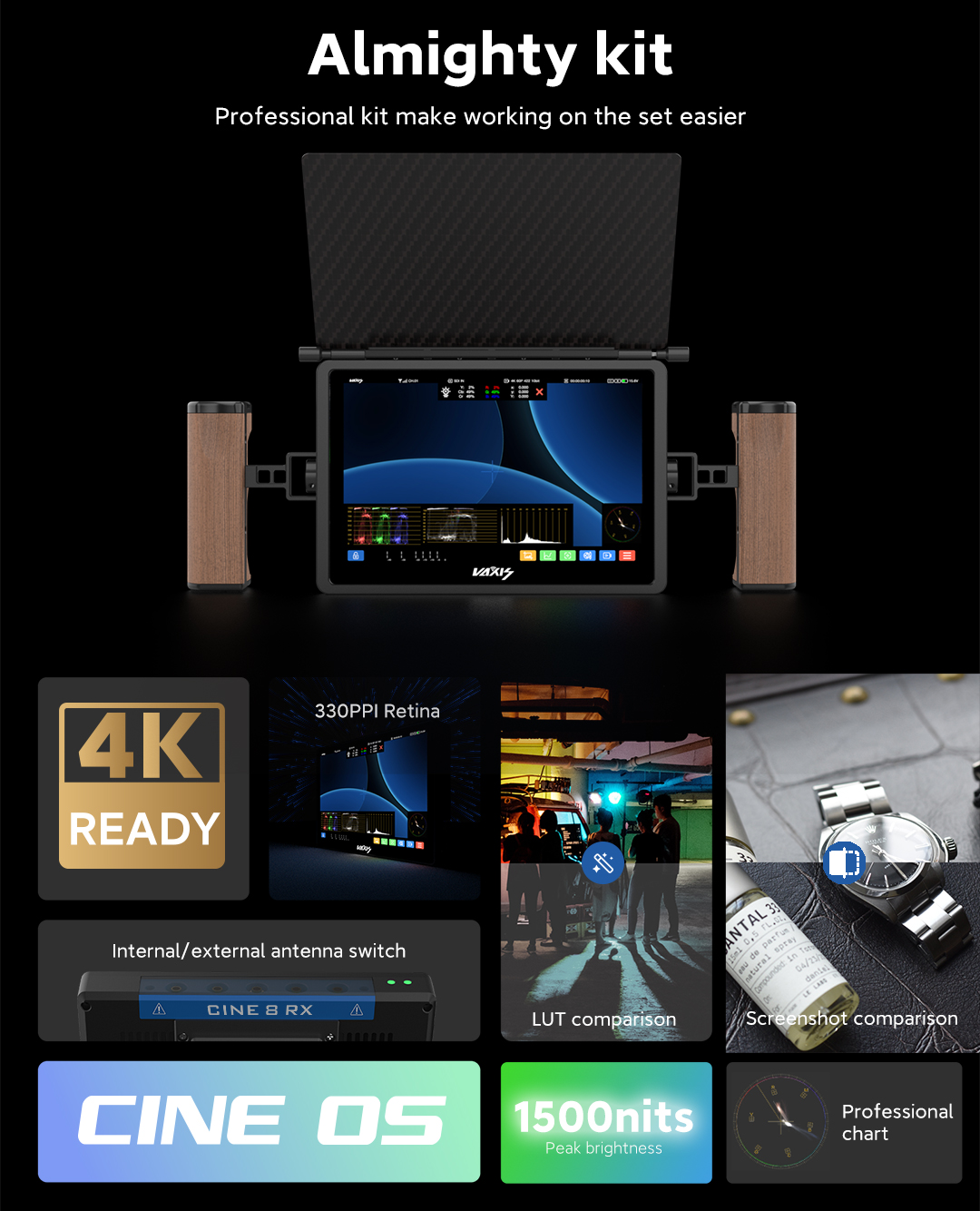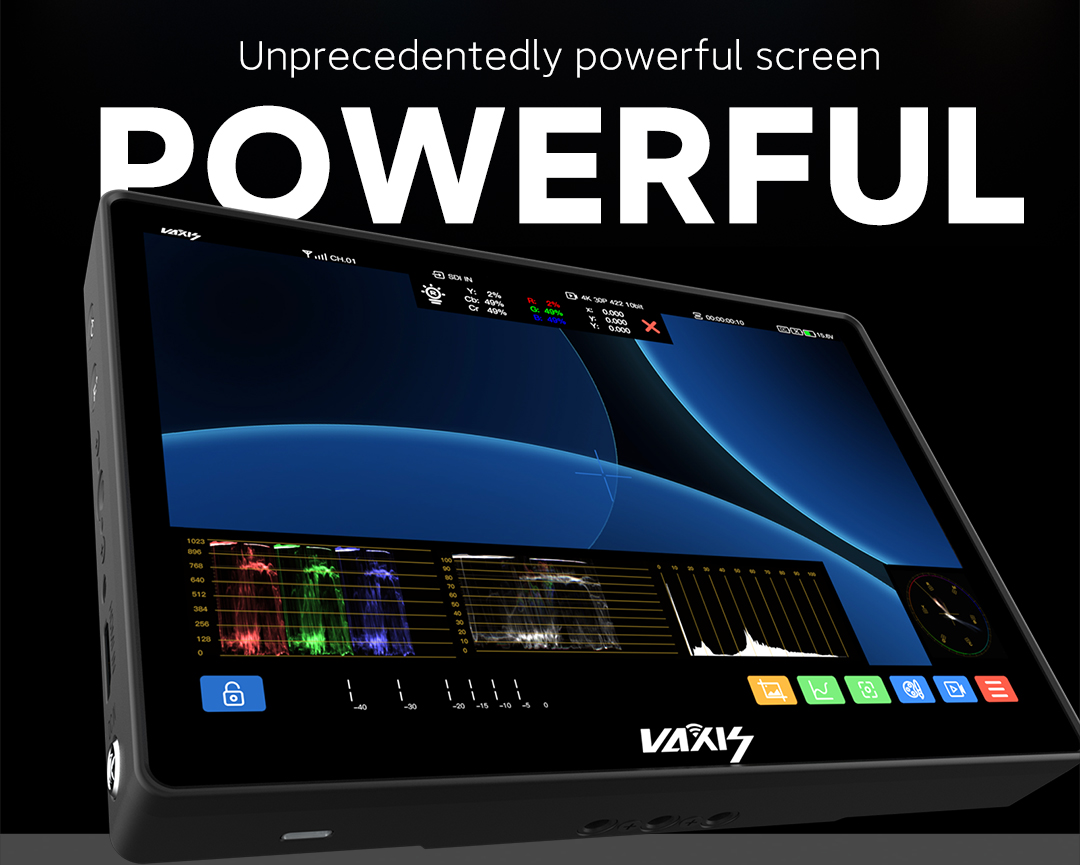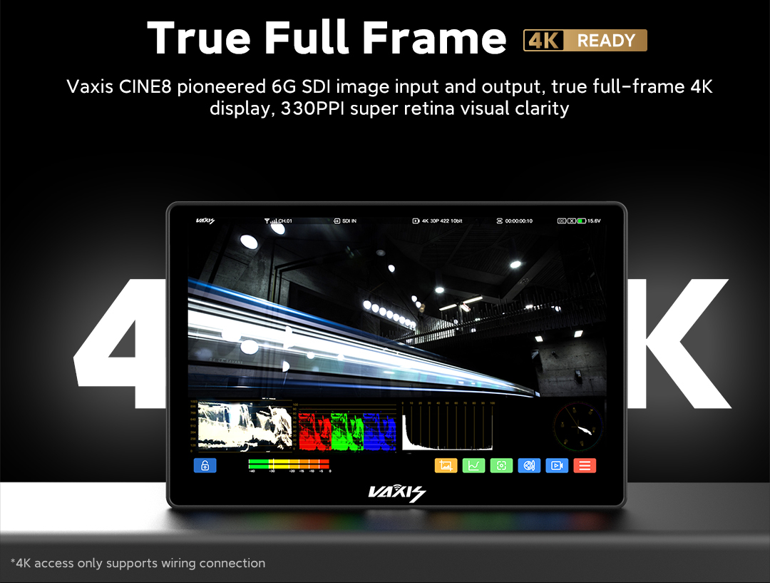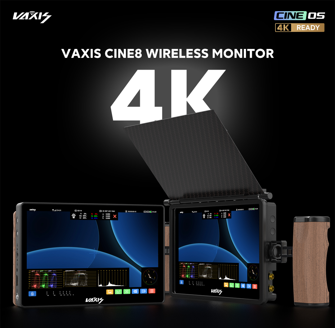 Mají všechny funkce tradičního bezdrátového videosystému a optimalizovaný způsob interakce. Poskytuje různé metody výběru antény a integruje funkci frekvenčního rozsahu. Podrobný monitorovací nástroj. Grafy průběhů, vektorové diagramy, histogramy, obálky a obsahují vše. Skutečný Full Frame 4K READY. Vaxis CINE8 je průkopníkem v oblasti vstupu a výstupu obrazu 6G SDI, skutečný full frame 4K displej, 303PPI super retina vizuální čistota. 1+1 > 2. Současné zobrazení obrazu z více úhlů kamery AB