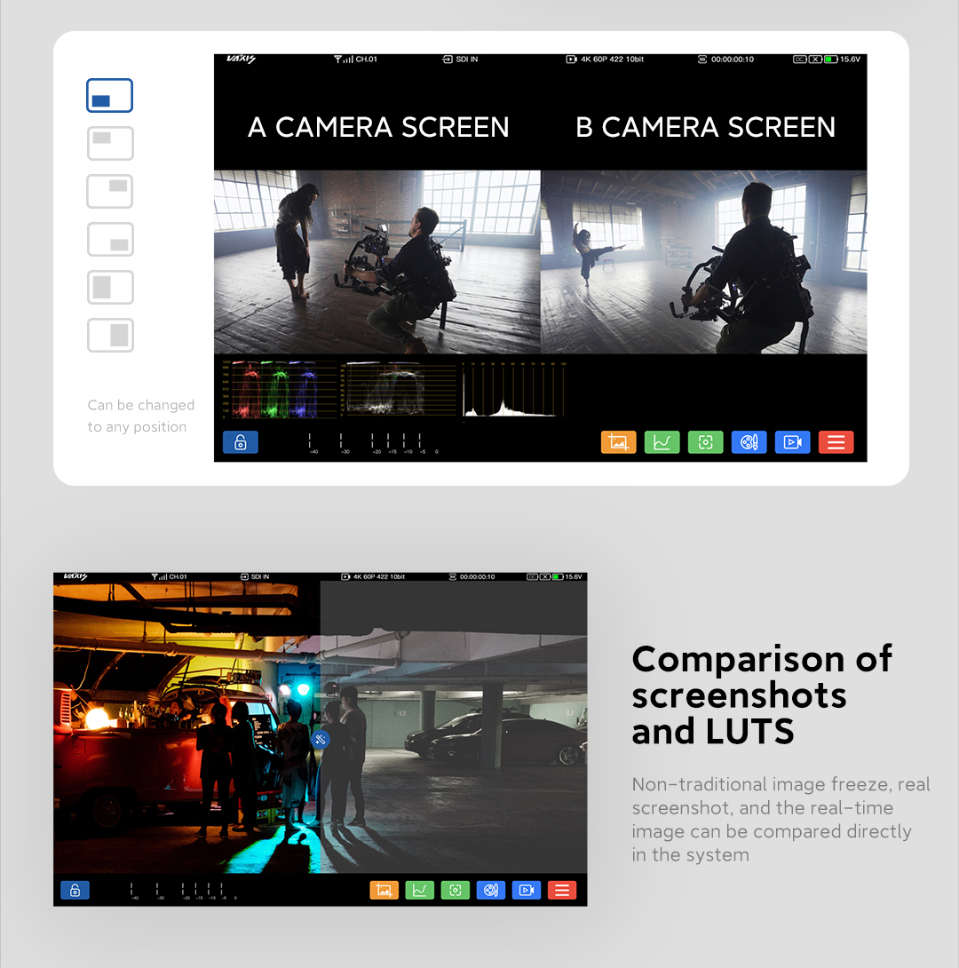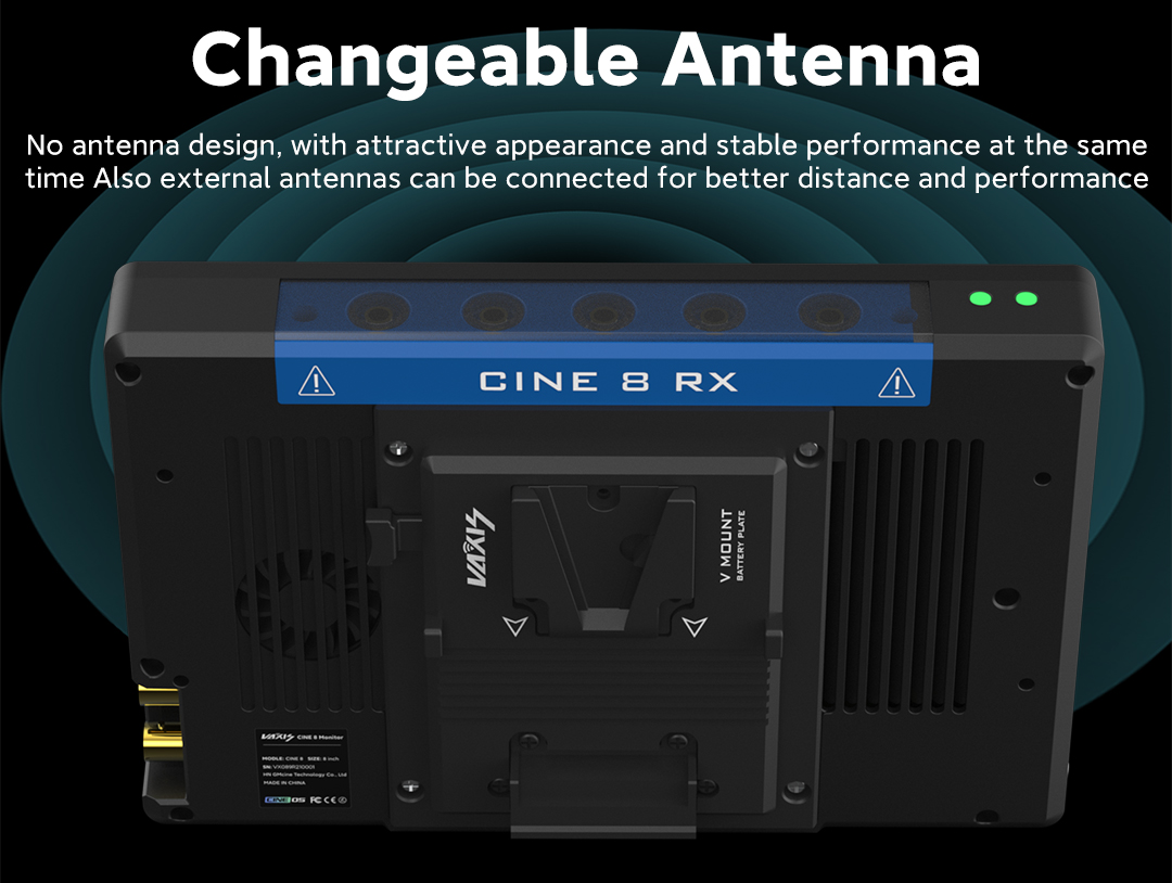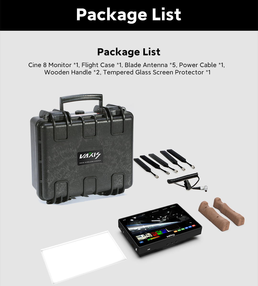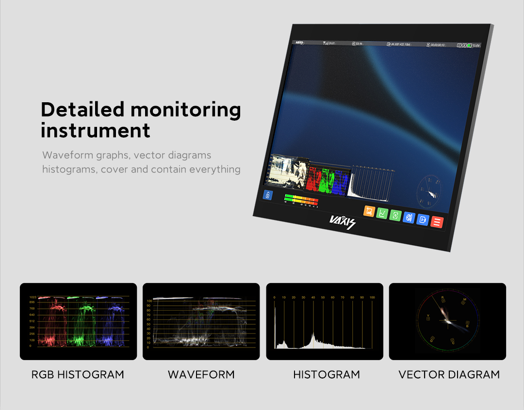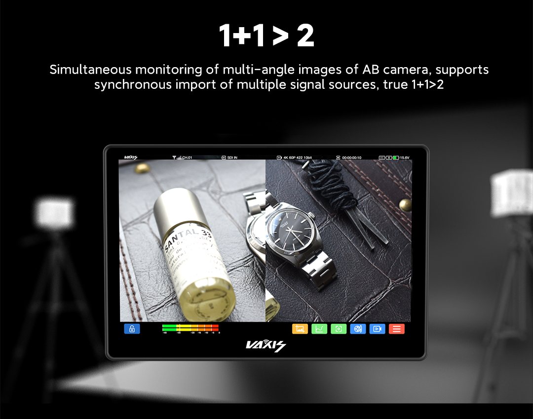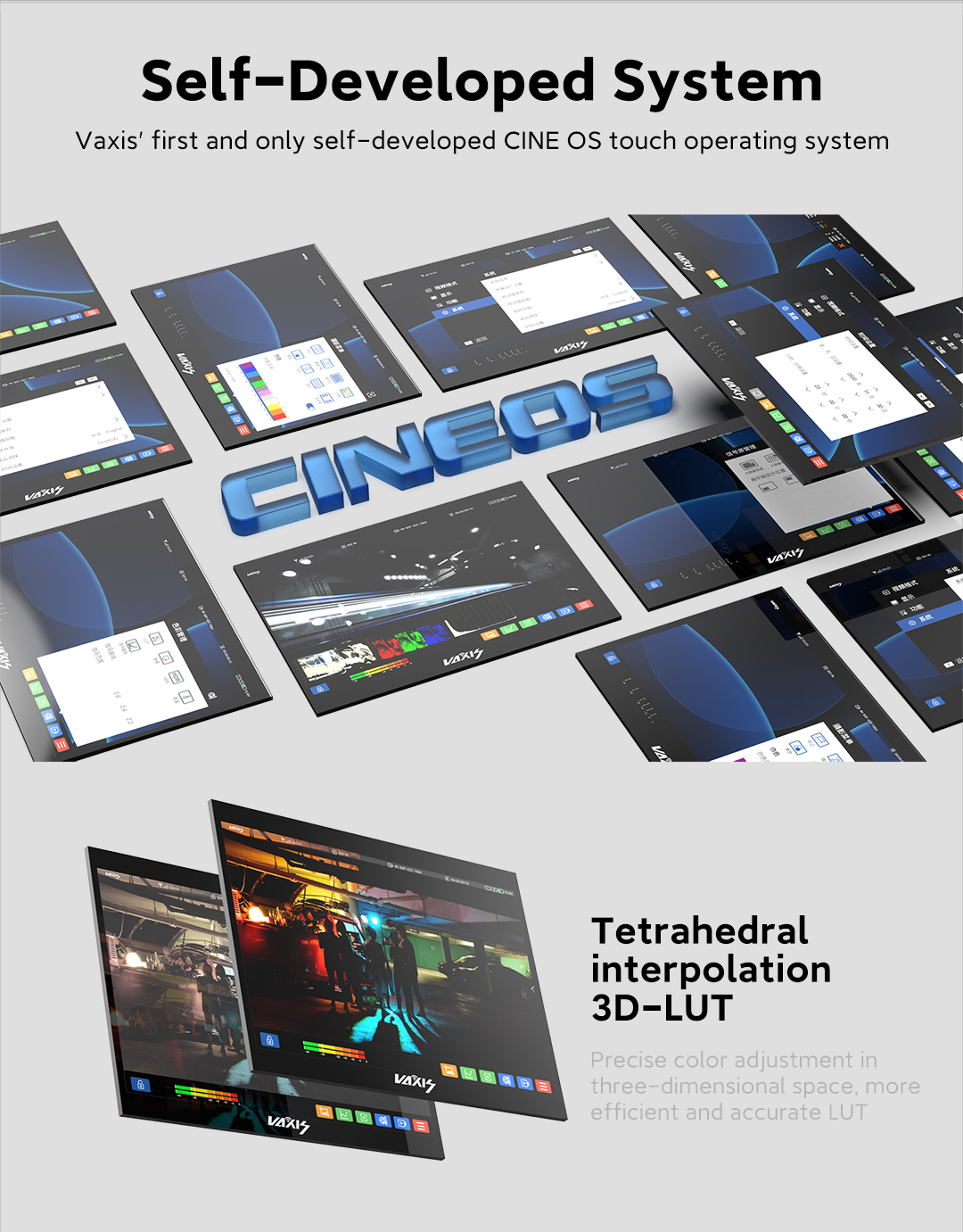 Mají všechny funkce tradičního bezdrátového videosystému a optimalizovaný způsob interakce. Poskytuje různé metody výběru antény a integruje funkci frekvenčního rozsahu. Podrobný monitorovací nástroj. Grafy průběhů, vektorové diagramy, histogramy, obálky a obsahují vše. Skutečný Full Frame 4K READY. Vaxis CINE8 je průkopníkem v oblasti vstupu a výstupu obrazu 6G SDI, skutečný full frame 4K displej, 303PPI super retina vizuální čistota. 1+1 > 2. Současné zobrazení obrazu z více úhlů kamery AB