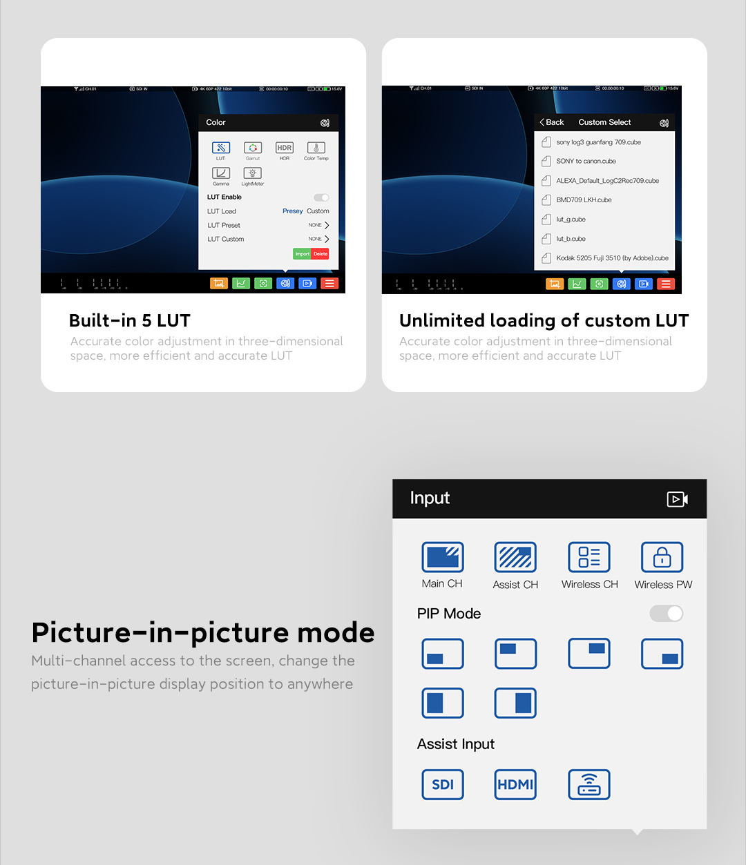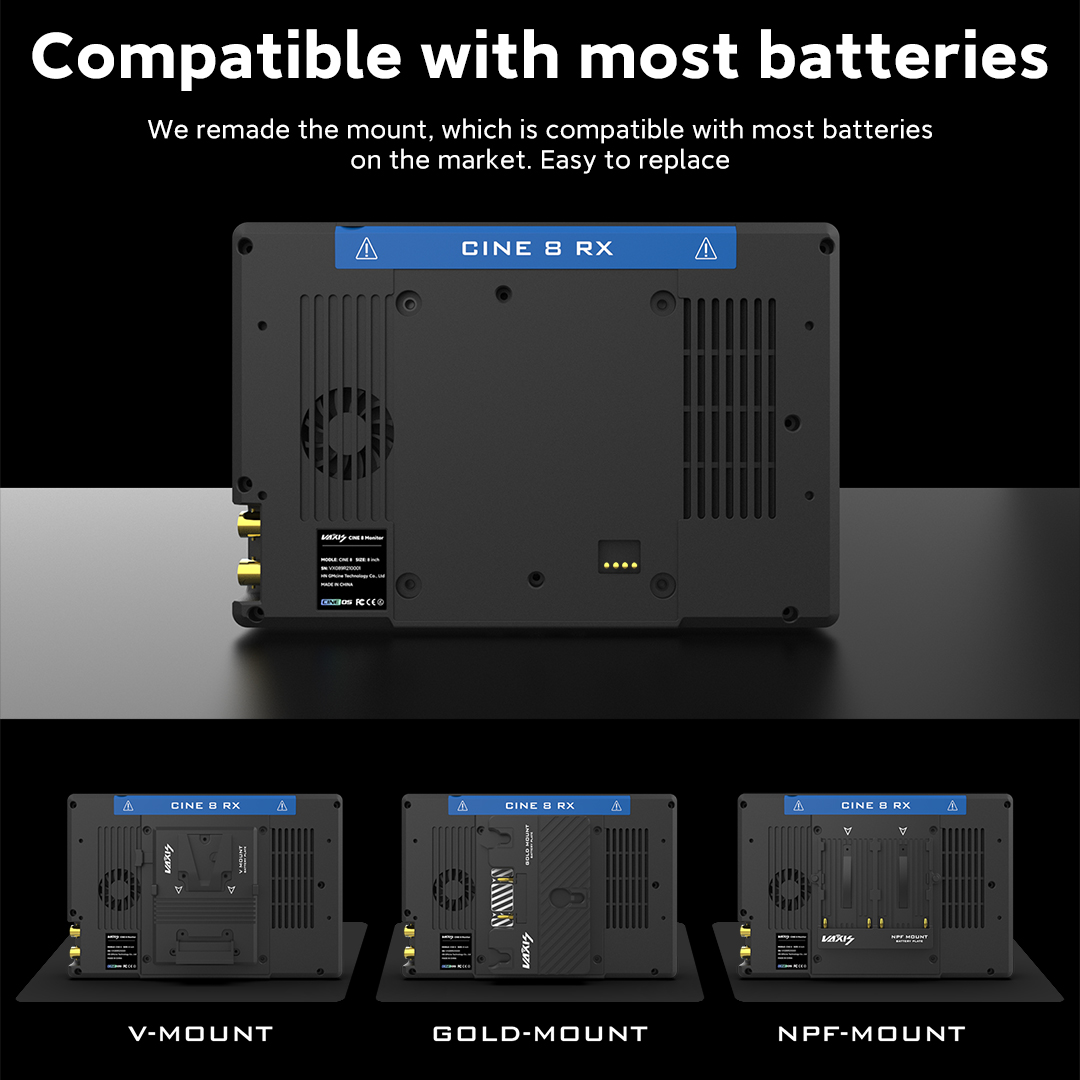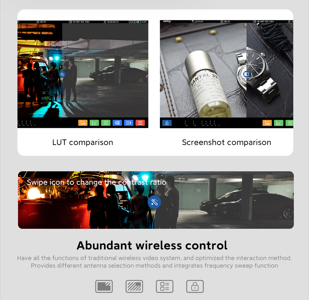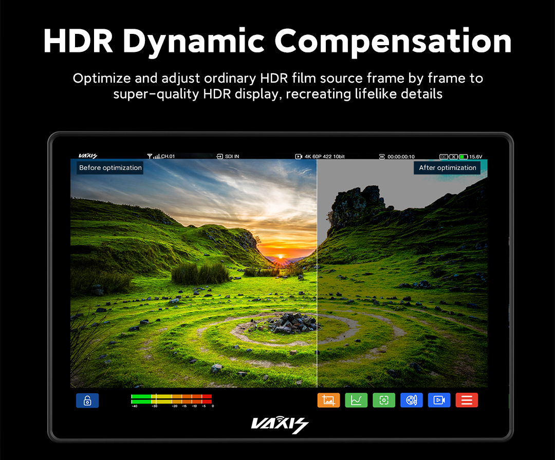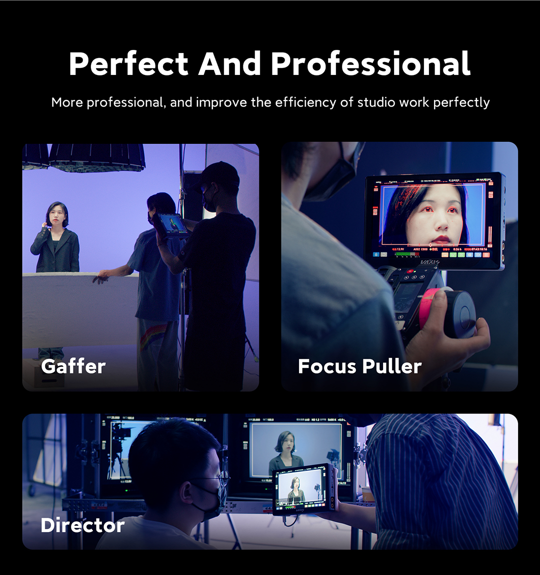 Mají všechny funkce tradičního bezdrátového videosystému a optimalizovaný způsob interakce. Poskytuje různé metody výběru antény a integruje funkci frekvenčního rozsahu. Podrobný monitorovací nástroj. Grafy průběhů, vektorové diagramy, histogramy, obálky a obsahují vše. Skutečný Full Frame 4K READY. Vaxis CINE8 je průkopníkem v oblasti vstupu a výstupu obrazu 6G SDI, skutečný full frame 4K displej, 303PPI super retina vizuální čistota. 1+1 > 2. Současné zobrazení obrazu z více úhlů kamery AB