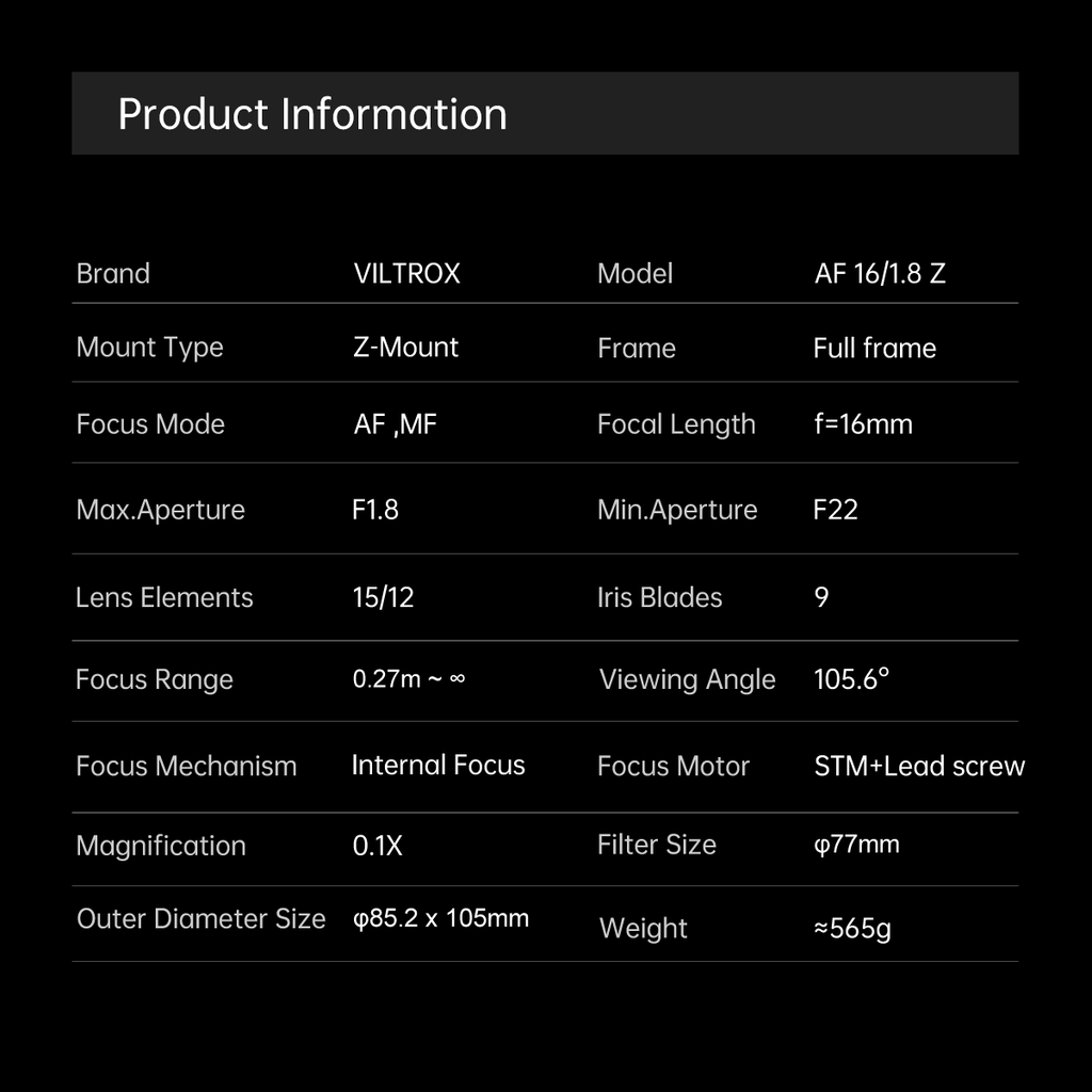 AF 16 mm F1,8 Z využívá optickou konstrukci objektivu z 15 členů ve 12 skupinách se třemi vestavěnými asférickými čočkami, které vytvářejí zážitek z obrazu s vysokým rozlišením.
