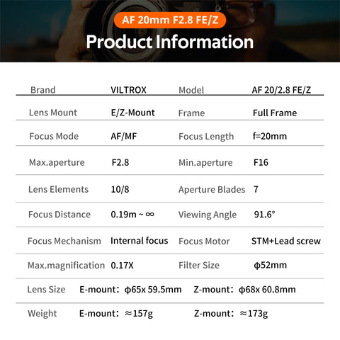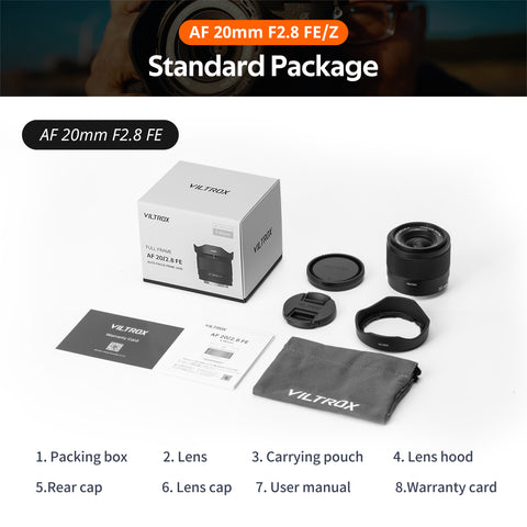 Viltrox AF 20 / 2,8 FE je objektiv s automatickým ostřením určený pro modely fotoaparátů Sony s bajonetem E / Nikon Z. Díky 10 členům v 8 skupinách se vyznačuje vynikajícím optickým výkonem. Minimální zaostřovací vzdálenost cca 0,19 m vytváří pěkné záběry zblízka. A tichý zaostřovací motor STM dokáže přesně kontrolovat pohyblivou polohu a přináší přesné a plynulé zaostřování. Skvělá volba pro fotografování portrétů, krajiny, detailních záběrů a vlogů!
