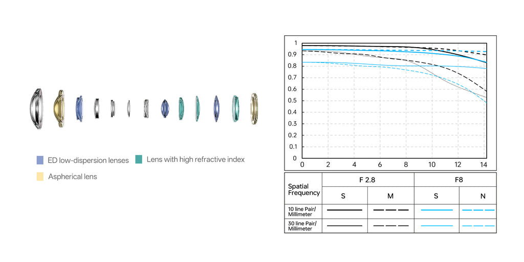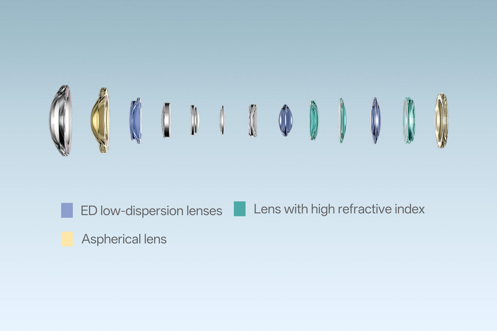 Pečlivě vyrobená optická konstrukce s 13 prvky v 11 skupinách zahrnuje 2 asférické, 3 ED a 3 HR prvky pro účinnou kontrolu chromatické aberace a zkreslení a zároveň poskytuje výjimečnou ostrost od okraje k okraji v ultraširokých snímcích.