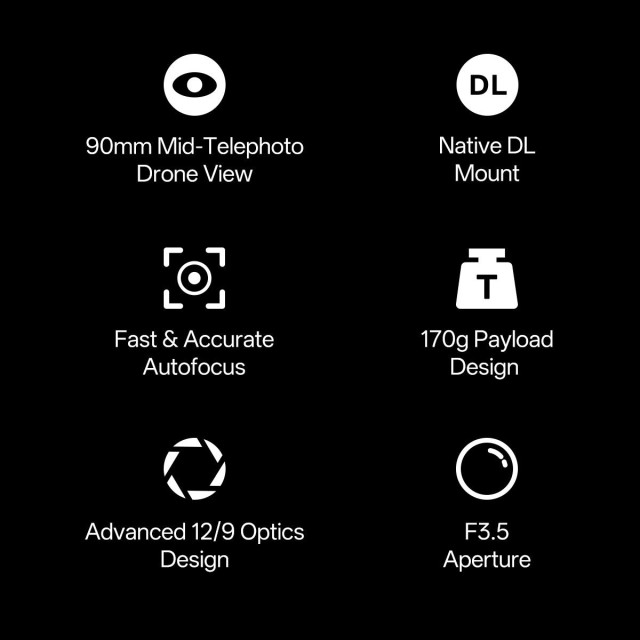 Nativní bajonet DL AF 90mm F3.5 je díky nativnímu bajonetu DL bezproblémově kompatibilní s kamerou X9-8K Air s gimbalem na Inspire 3 a nabízí nový výkonný střední teleobjektiv pro letecké snímání.