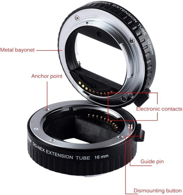 Vysoce kvalitní automatická sada prodlužovacích makro trubic umožňuje zaostřit blíže pro zvětšené objekty v makrofotografii. Přemění jakýkoli objektiv na makroobjektiv za zlomek ceny s původní optickou kvalitou. Prodlužovací trubice DG vytvářejí vzdálenost mezi objektivem a rovinou filmu a vynucují si tak bližší zaostření.