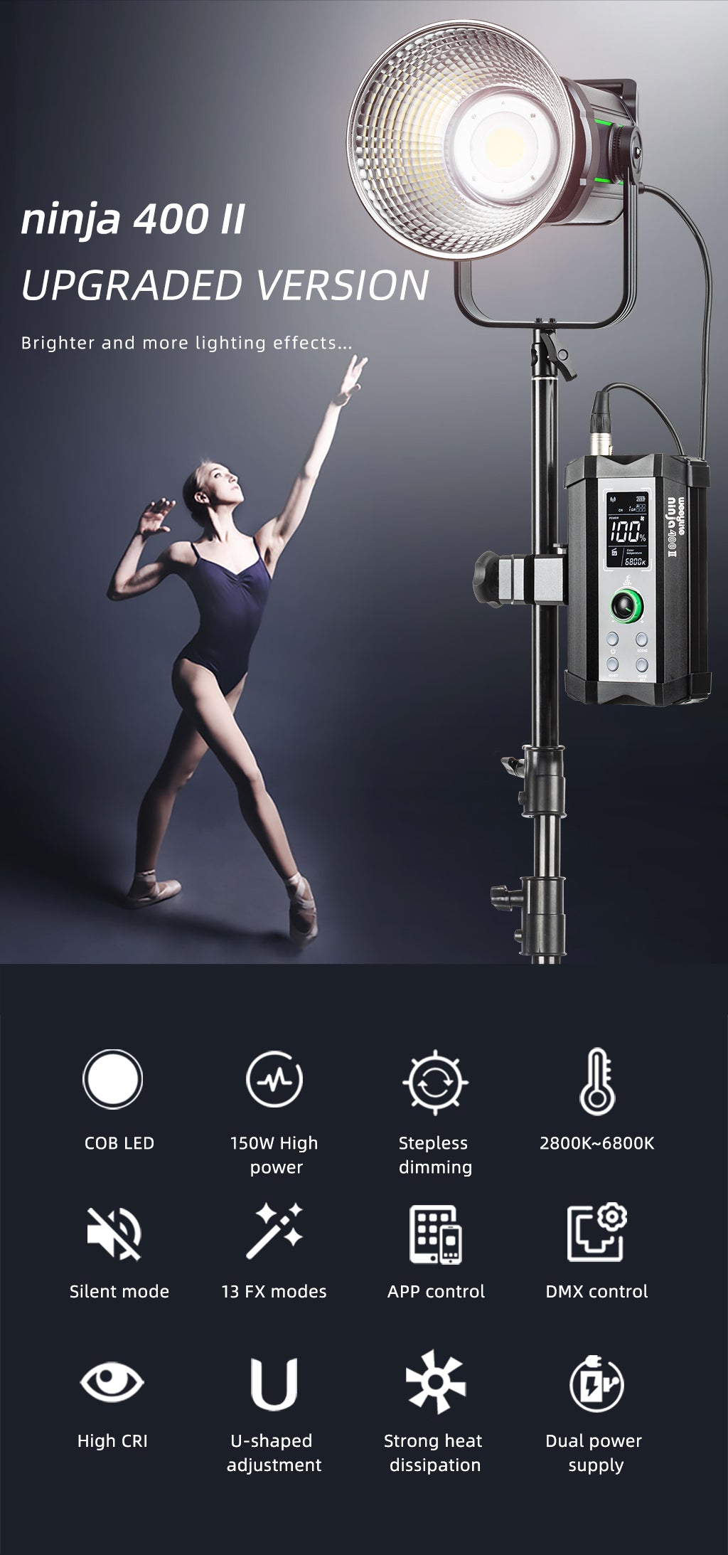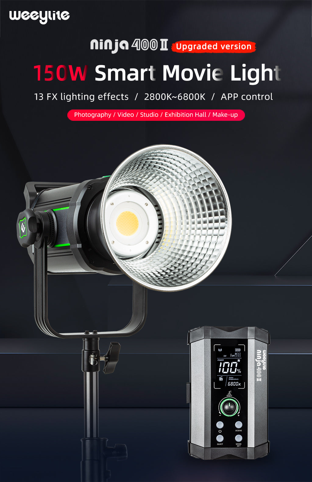 Nástupce oblíbeného reflektoru Viltrox Weeylite Ninja 400 přináší nové světelné efekty a tichý režim (s omezením rozsahu intenzity 0-50 %). Studiový 150W Bi-color LED reflektor Weeylite Ninja 400 II využívá COB LED technologii pro vysoký světelný výkon, dlouhou životnost a dobré podání barev (≥95 RA).
