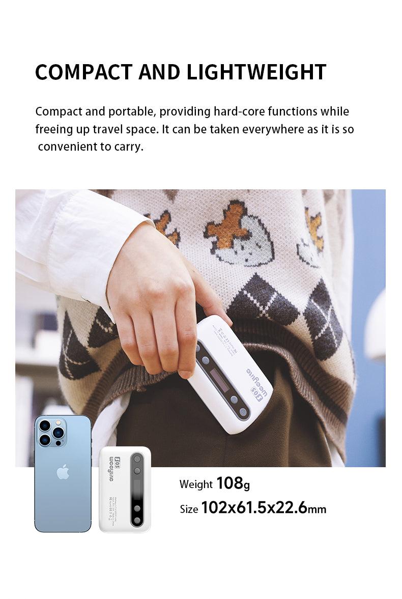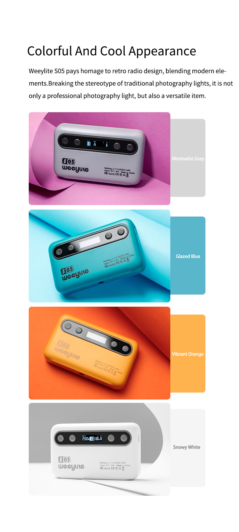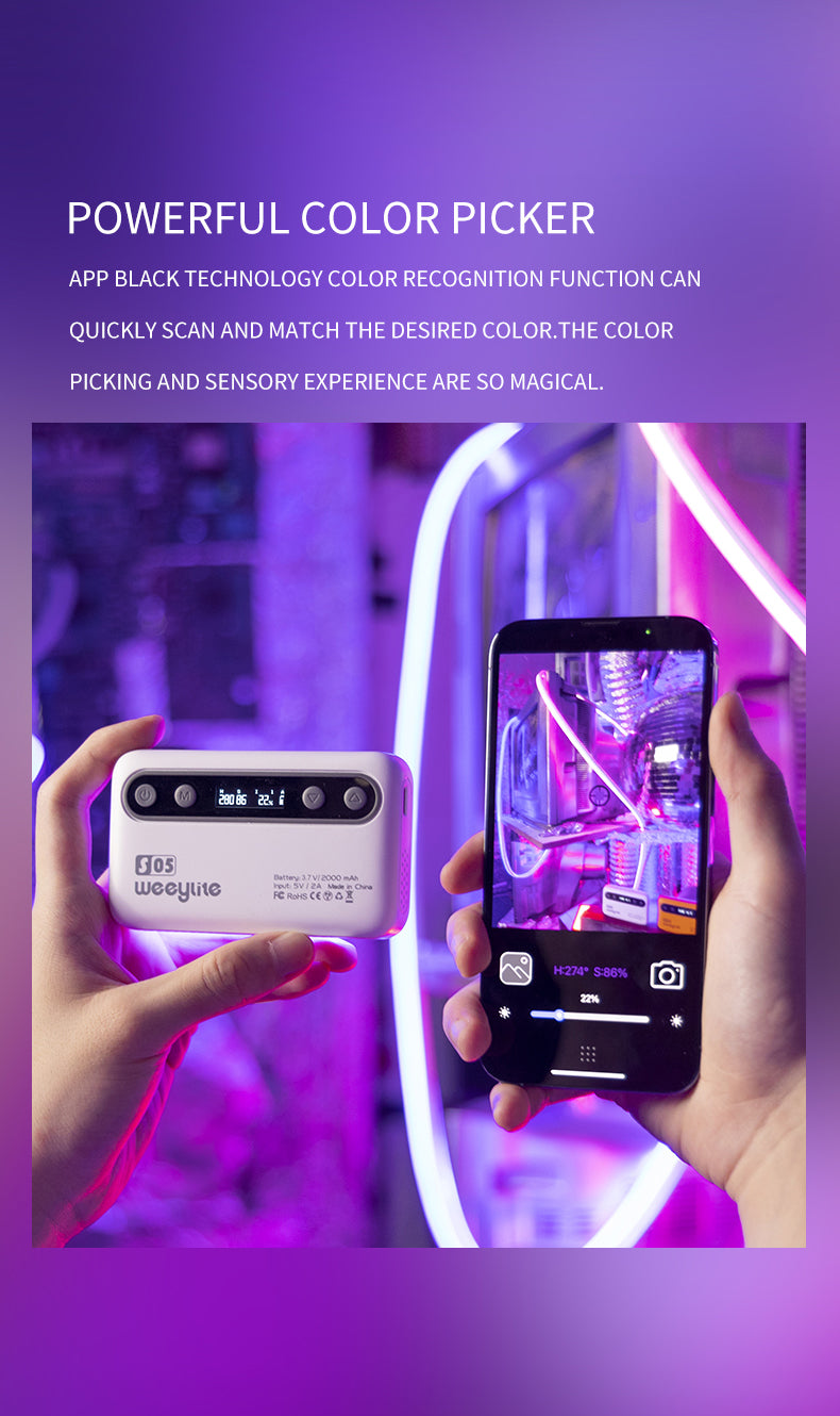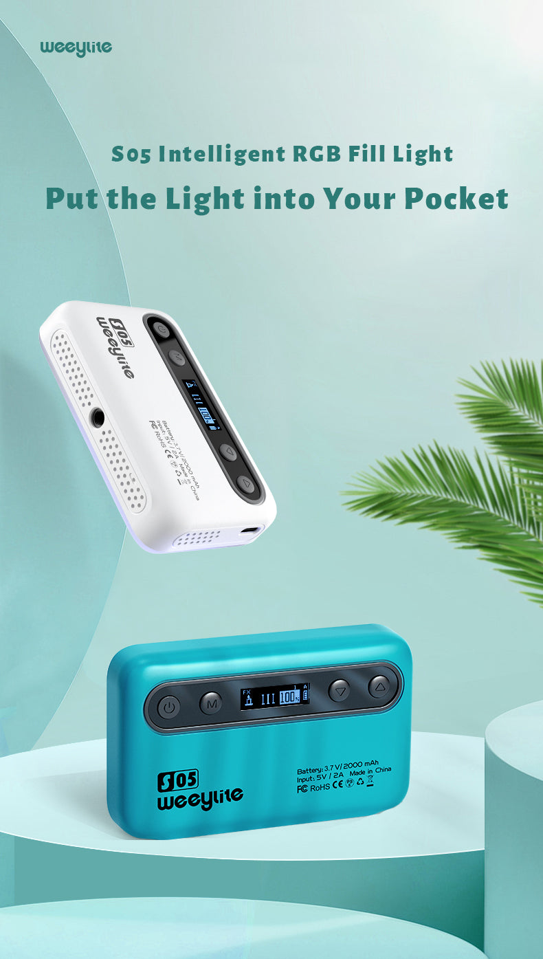 Weeylite S05 fill light je přenosné kapesní výplňové světlo. Disponuje vysoce výkonnými barevnými (pozitivní bílá + teplá bílá) a vysoce kvalitními světelným led diodami RGB. Má nízkou spotřebu energie, stabilní teplotu barev, úsporu energie a napájení, dlouhou životnost, kompaktních rozměry a dá se dobře přenášet. Světlo může být použito v různých scénách a dokonale se hodí pro fotografování, natáčení videa, nahrávání vlogů, živé vysílání atd.