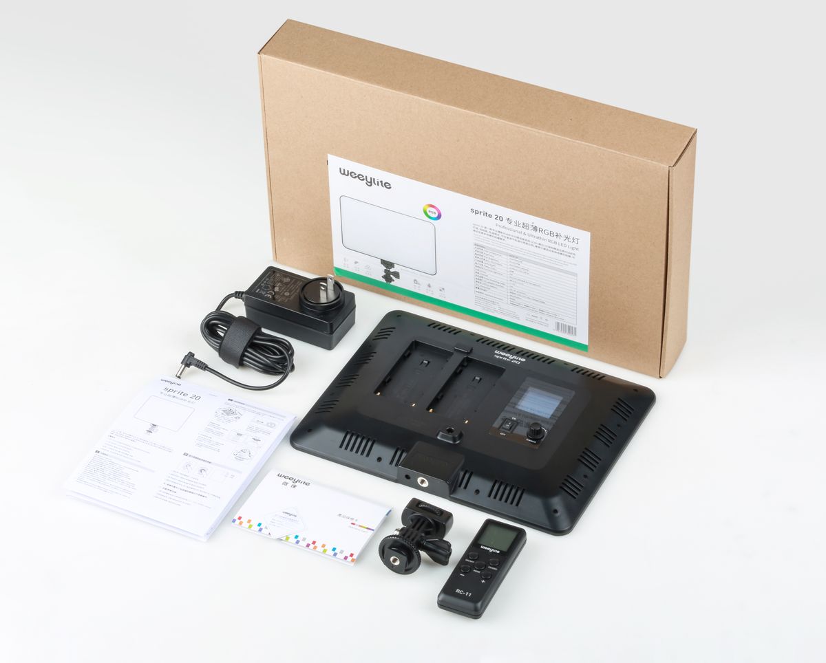 Sprite 20 je RGB LED světlo s 265 elementy, barevnou teplotou nastavitelnou v rozsahu 2500-8500K, stmíváním 0-100 %, indexem podání barev CRI 95+, bezdrátovým dálkovým ovládáním (Bluetooth) a presety světelných efektů (Flash, Alarm, Movie, Rainbow, Party Atmosphere, Fairytale etc.). Pomocí aplikace pro dálkové ovládání lze spravovat jedno nebo skupinu světel; integrovaný LCD displej zobrazuje informace o nastavené barevní teplotě, jasu, stavu baterií apod. Lze napájet prostřednictvím napájecího adaptéru nebo pomocí akumulátorů NP-F550/F570/F960/F970 (nejsou součástí dodávky). Rozměry 26 x 20 x 2,9 cm, váha 540 g.