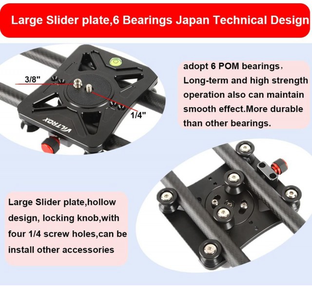 80cm kamerový slider Viltrox VC-80 je vyroben z uhlíkového kompozitního materiálu a přes svou nízkou váhu podporuje kamerové sestavy s vahou až 10 kg! Kamerová destička je vybavena šroubem 3/8"-16, slider nabízí také polohovatelné nohy a závity 1/4"-20 a 3/8"-16 na spodní resp. 1/4"-20 na horní straně podpěr pro široké možnosti montáže. Samozřejmostí je i přepravní brašna.