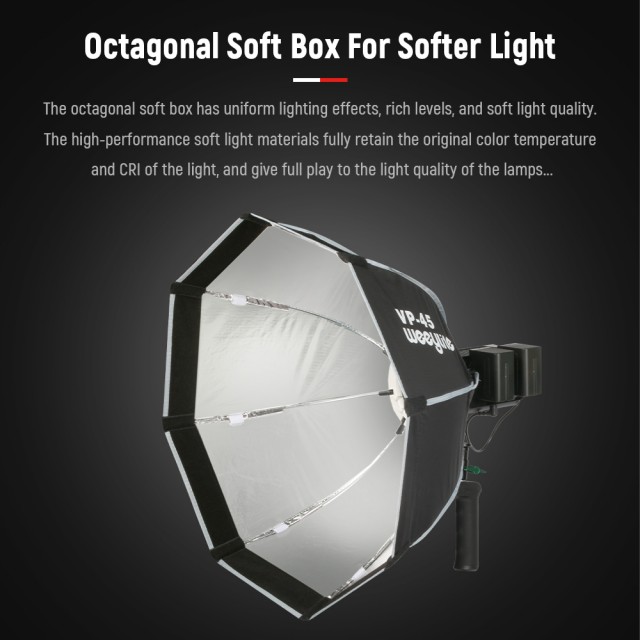 Softbox pro LED reflektor Viltrox Weeylite Ninja 200. Průměr 60 cm, hloubka 30 cm, váha 0,41 kg. Balení obsahuje přepravní brašnu (rozměry ve složeném stavu 45 x 17 x 17 cm, 0,79 kg).