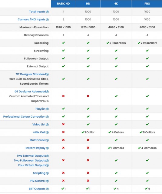 Verze softwaru vMix4K má všechny parametry stejné jako verze vMixHD, ale navíc má tyto parametry