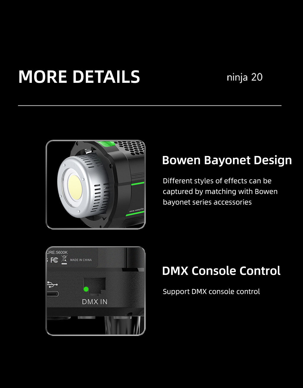 Weeylite Ninja 20 od společnosti Viltrox je svítidlo LED s denním světlem 5600K a výkonem 200 W. Jeho technologie COB LED poskytuje výkon bez blikání s nadprůměrnou hlučností a rozptylem tepla. Je vybaveno držákem Bowens, který je kompatibilní s nejrůznějšími nástroji pro tvarování světla, a tělo světla je vyrobeno výhradně z kovu. Má chladič z ocelových trubek a vestavěný ventilátor pro chlazení.