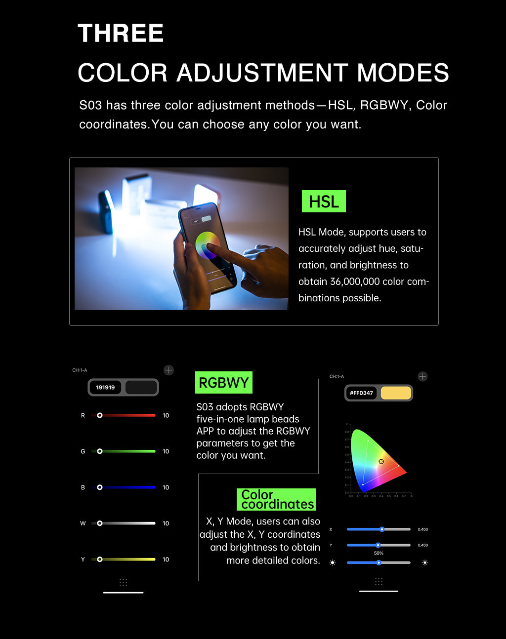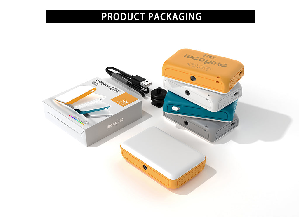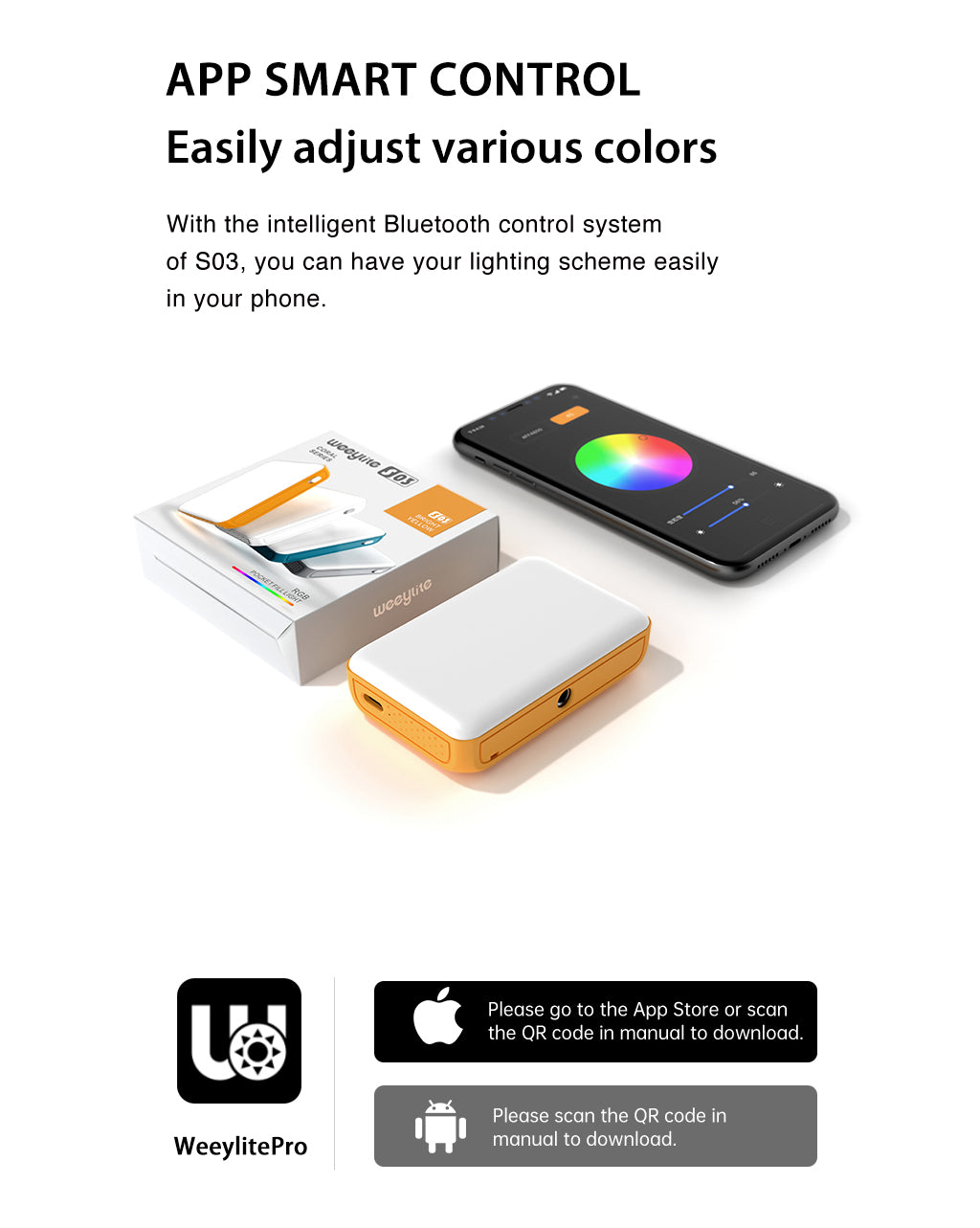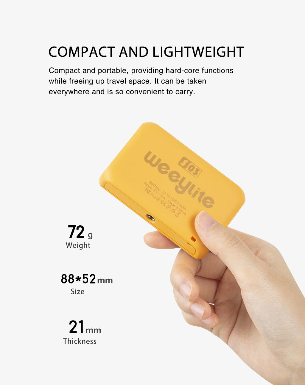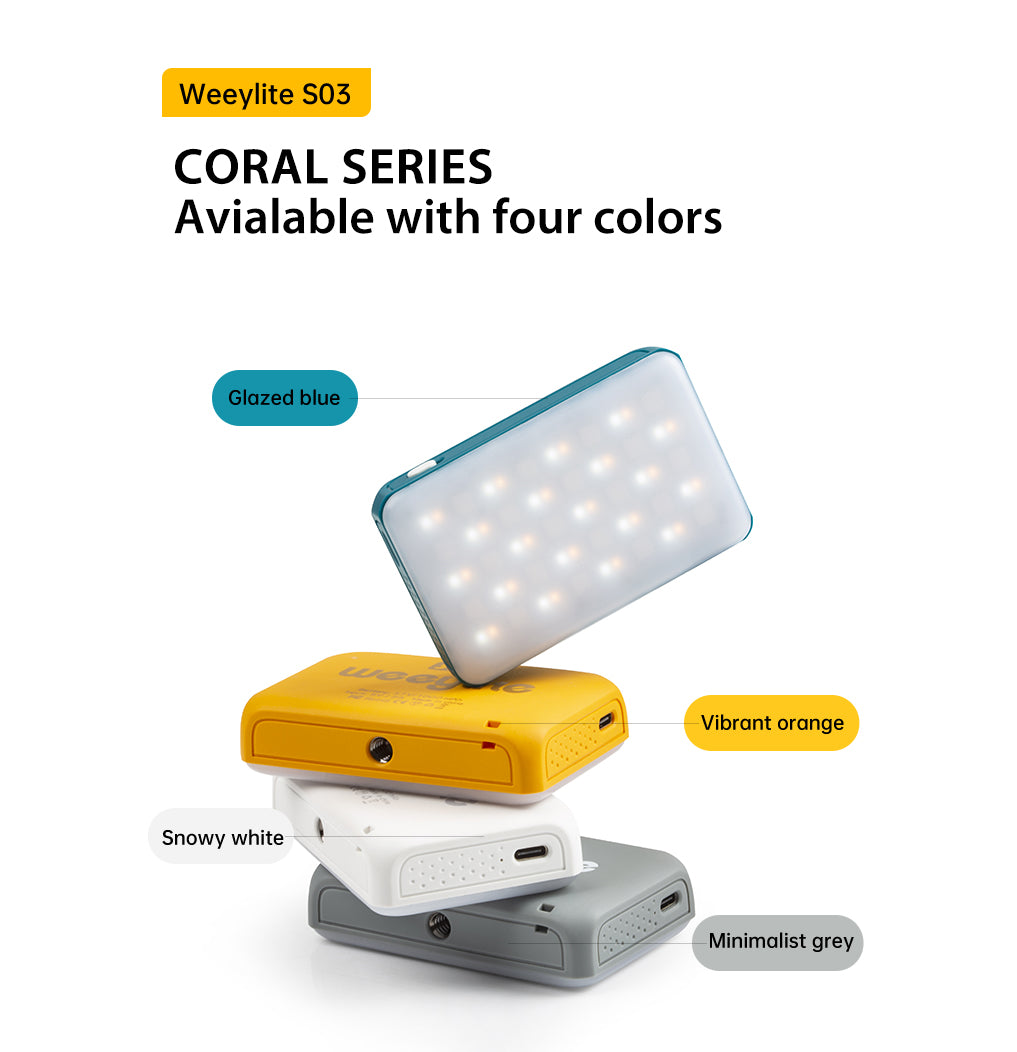 Kapesní 4W LED světlo Weeylite S03 kombinuje 60 bílých/teplých bílých/RGB LED diod do unikátního kompaktního těla (tl. pouze 21 mm, váha cca 70 g) s možností dálkového ovládání (Bluetooth, iOS/Andoid) jasu v rozsahu 1-100 % a barevné teploty v rozmezí 2800-6800 K. Světlo je vybaveno interním akumulátorem s vydrží cca 1…