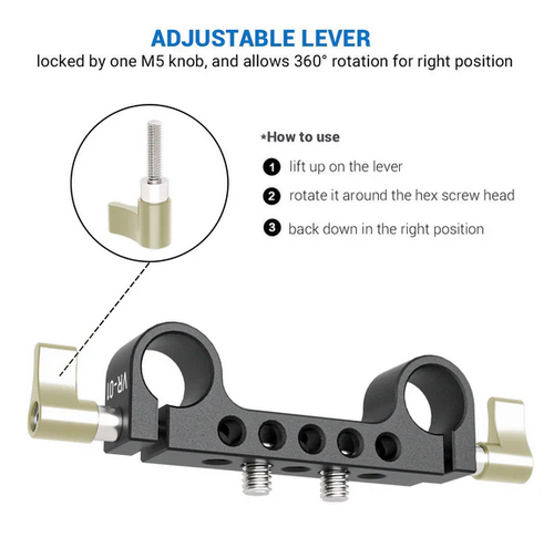 ZGCINE 15mm Railblock je odolná svorka se dvěma tyčemi určená pro 15mm kolejnicové nosné systémy. Je vybavena několika otvory se závitem 1/4''-20 pro upevnění příslušenství a pružinovou ráčnovou maticí pro snadné nastavení ve stísněných prostorech.