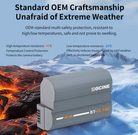 ZGCINE BT-EL15C je profesionální lithium-iontová baterie s kapacitou 2400 mAh, která je navržena jako bezproblémová náhrada za baterii Nikon EN-EL15c (a je zpětně kompatibilní s bateriemi EN-EL15b/a). Je plně dekódovaná, komunikuje s tělem fotoaparátu, zobrazuje přesné procento nabití baterie a podporuje bezchybné nabíjení ve fotoaparátu. Je vyrobena z prémiových lithium-iontových článků a má 8vrstvý ochranný systém (před přebitím, nadproudem, zkratem, přehřátím atd.), který zajišťuje stabilní a bezpečný výkon. V kombinaci s nabíjecími pouzdry řady ZGCINE PS nebo nabíječkami řady PC podporuje vysokorychlostní nabíjení a dosáhne 100 % kapacity za pouhé 2 hodiny.