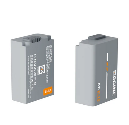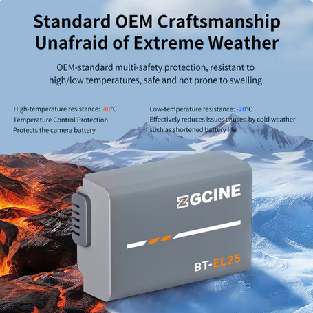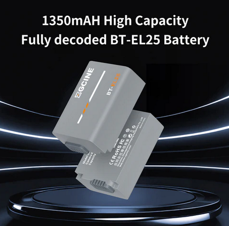 ZGCINE BT-EL25 je plně dekódovaná náhradní baterie od jiného výrobce s kapacitou 1280 mAh (7,7 V) pro fotoaparáty Nikon Z30, Z50 a Zfc, která se shoduje s originální baterií EN-EL25 co do velikosti a výkonu – žádné varování, plná komunikace s fotoaparátem – a zároveň podporuje ultrarychlé nabíjení (plné nabití za ~2 hodiny s nabíječkami ZGCINE PS/PC) a je vybavena prémiovou 8vrstvou bezpečnostní ochranou.