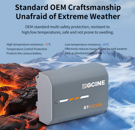 BT-FZ100 je plně dekódovaná vysokokapacitní 2600mAh (7,2 V) náhradní baterie pro fotoaparáty Sony, která funguje stejně jako originální NP-FZ100 – žádné vyskakovací okna, plná komunikace s fotoaparátem a přesně stejná fyzická velikost – a navíc nabízí podporu rychlého nabíjení (plné nabití za ~2,5 hodiny s nabíječkami ZGCINE PS/PC) a prémiovou 8vrstvou bezpečnostní ochranu.