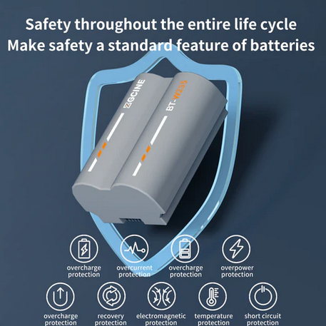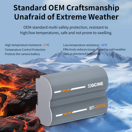 ZGCINE BT-W235 je plně dekódovaná náhradní baterie od jiného výrobce s kapacitou 2400 mAh (7,4 V) pro fotoaparáty Fujifilm, která se shoduje s originální baterií NP-W235 co do velikosti a výkonu – žádné varování, plná komunikace s fotoaparátem – a zároveň nabízí rychlé nabíjení (plné nabití za ~2 hodiny s nabíječkami ZGCINE PS/PC) a robustní 8vrstvou bezpečnostní ochranu pro spolehlivé a delší fotografování.