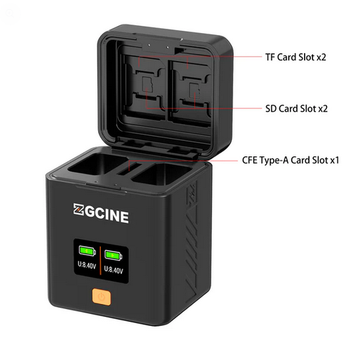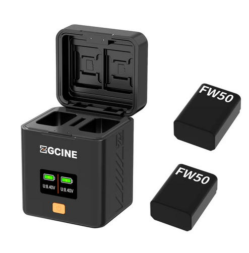 Nabíjecí pouzdro ZGCINE pro baterii SONY NP-FW50 je kompaktní a účinné nabíjecí řešení se vstupem USB-C PD, několika sloty pro paměťové karty a 0,96palcovým displejem OLED pro sledování stavu v reálném čase.