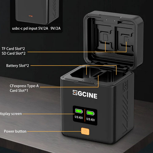 Nabíjecí pouzdro ZGCINE pro baterii SONY NP-FZ100 je kompaktní a multifunkční nabíjecí řešení se vstupem USB-C PD, dvěma sloty pro baterii, několika sloty pro karty a displejem OLED, které je ideální pro fotografy a kameramany na cestách.