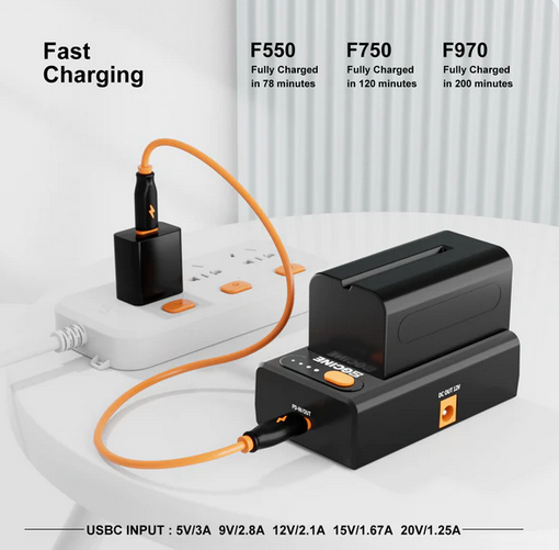 Díky rychlé době nabíjení pouhých 78 minut pro F550, 120 minut pro F750 a 200 minut pro F970 vám tato nabíječka zajistí, že budete vždy připraveni na další natáčení. Ať už potřebujete napájet své vybavení nebo rychle nabíjet baterie, tato nabíječka pro více použití je řešením, které potřebujete.